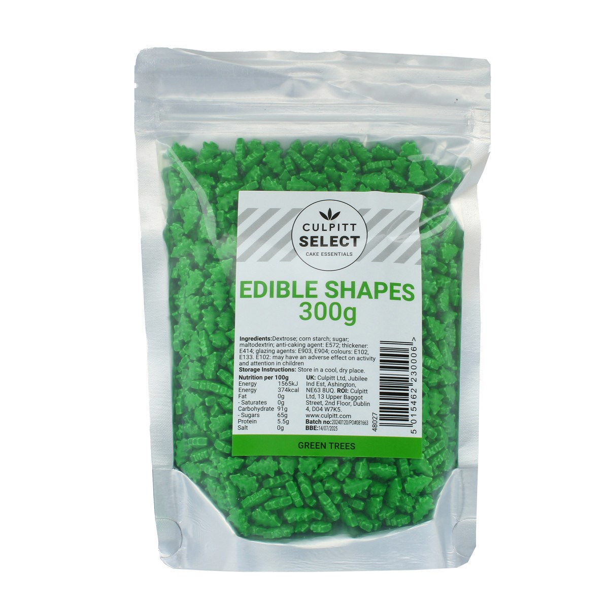 Culpitt Select green Christmas tree sprinkle shapes are a quick, cost-effective cake topping for professional cake decorating.