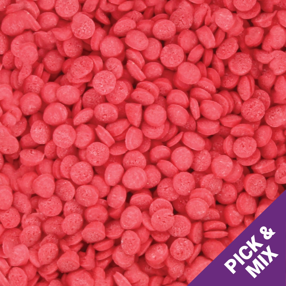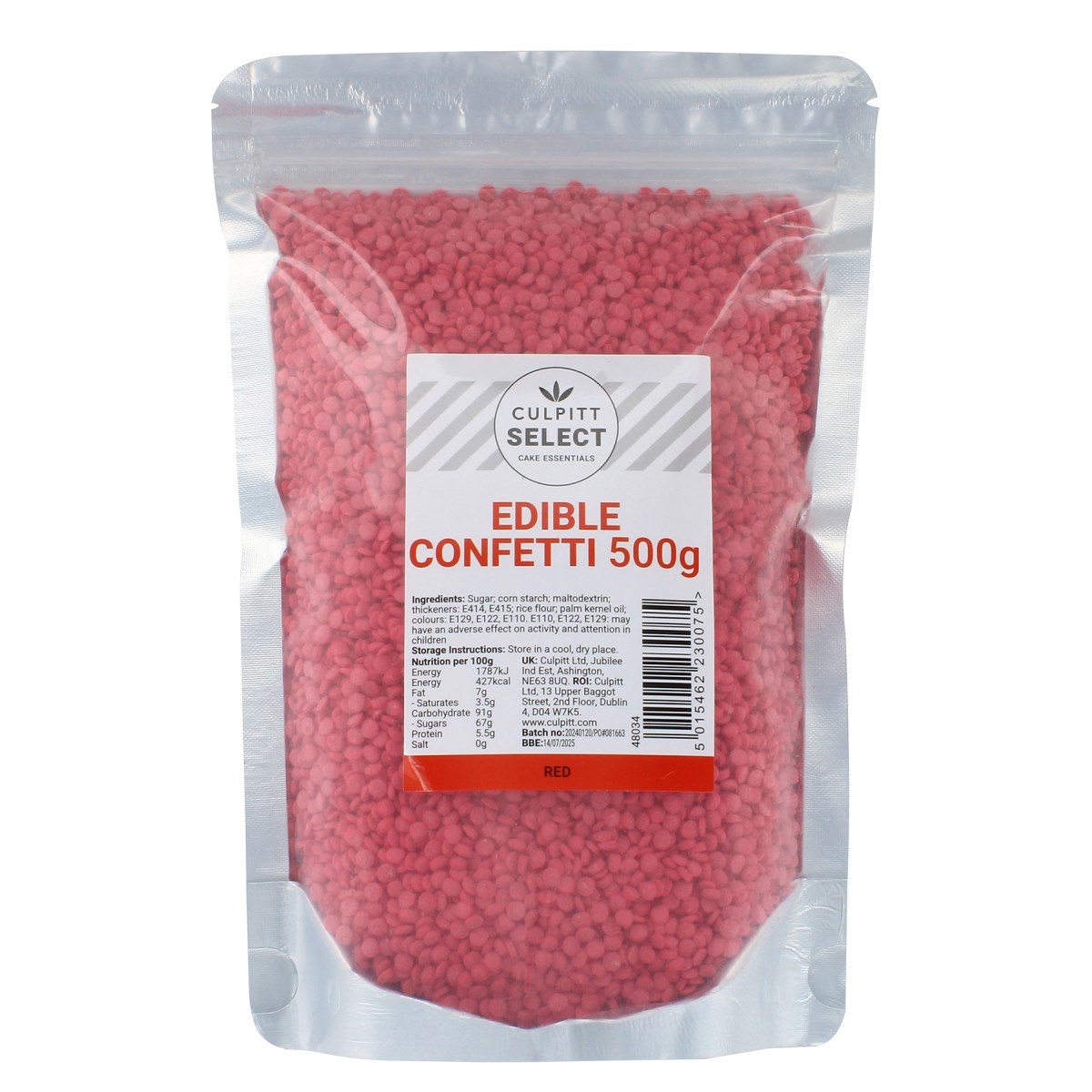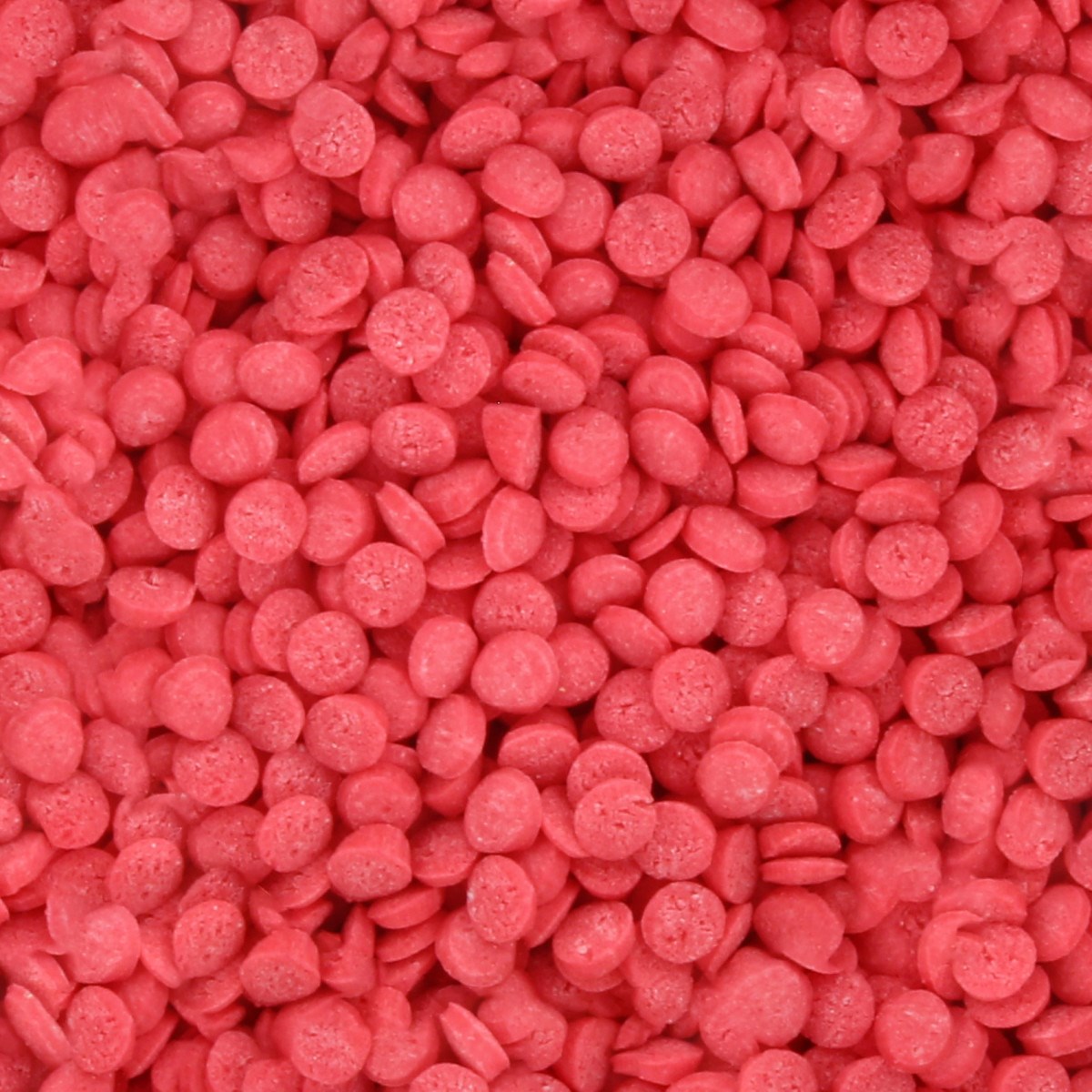 Culpitt Select red confetti sprinkles are a quick, cost-effective cake topping for professional cake decorating. They are often combined to make a rainbow confetti mix.