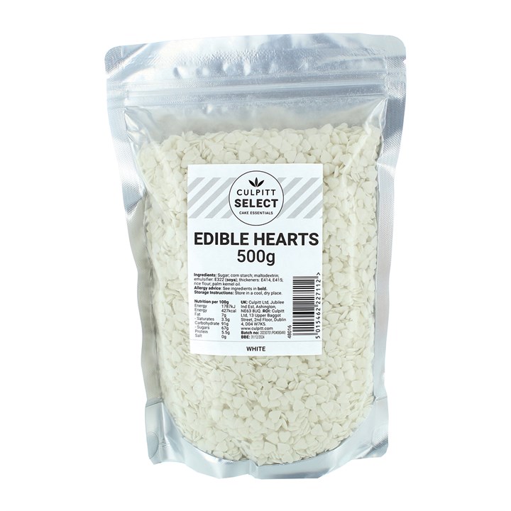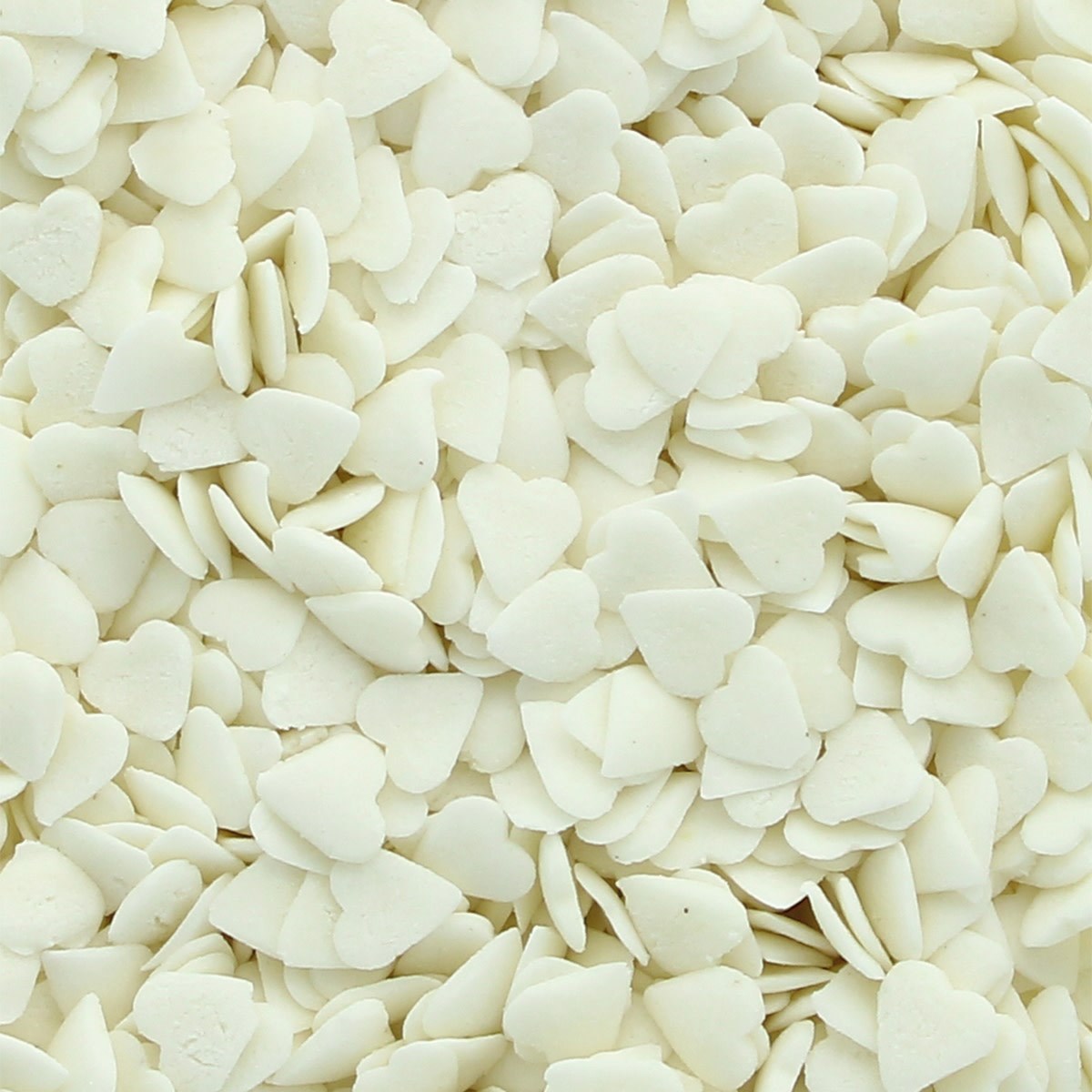 Culpitt Select white heart sprinkles are a quick, cost-effective cake topping for professional cake decorating.