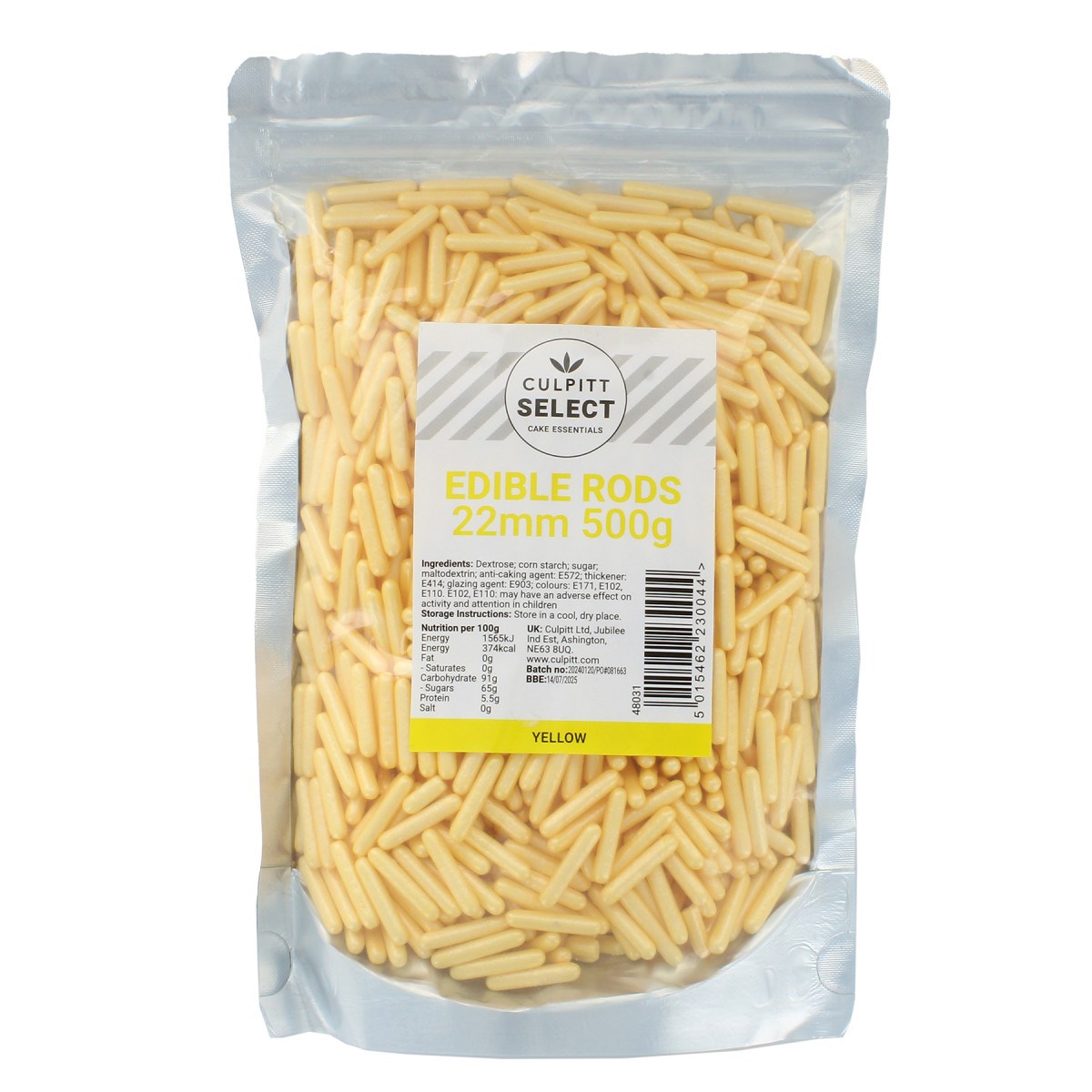 Each yellow edible sugar rod is approximately 22mm long. They have a delicate shimmer finish and are available in a range of complementary colours. They work well as single 'accent' sprinkle decorations for cupcakes, or mixed with other hundreds and thousands. They are particularly popular for baby shower cakes, Easter cakes, and special occasion cakes decorated in pastel colours.