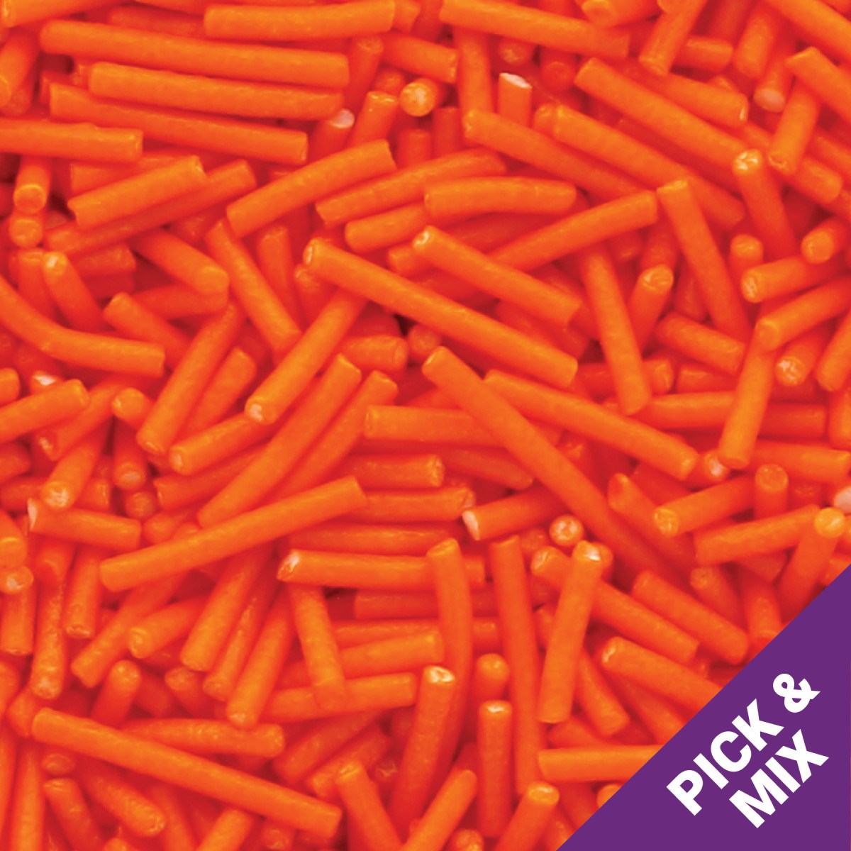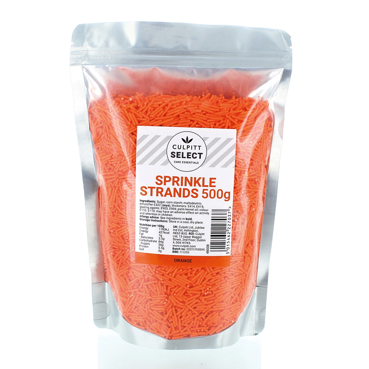 Culpitt Select orange sprinkle strands are a quick, cost-effective cake topping for professional cake decorating. They are commonly used as the base for the best hundreds and thousands sprinkle mixes.