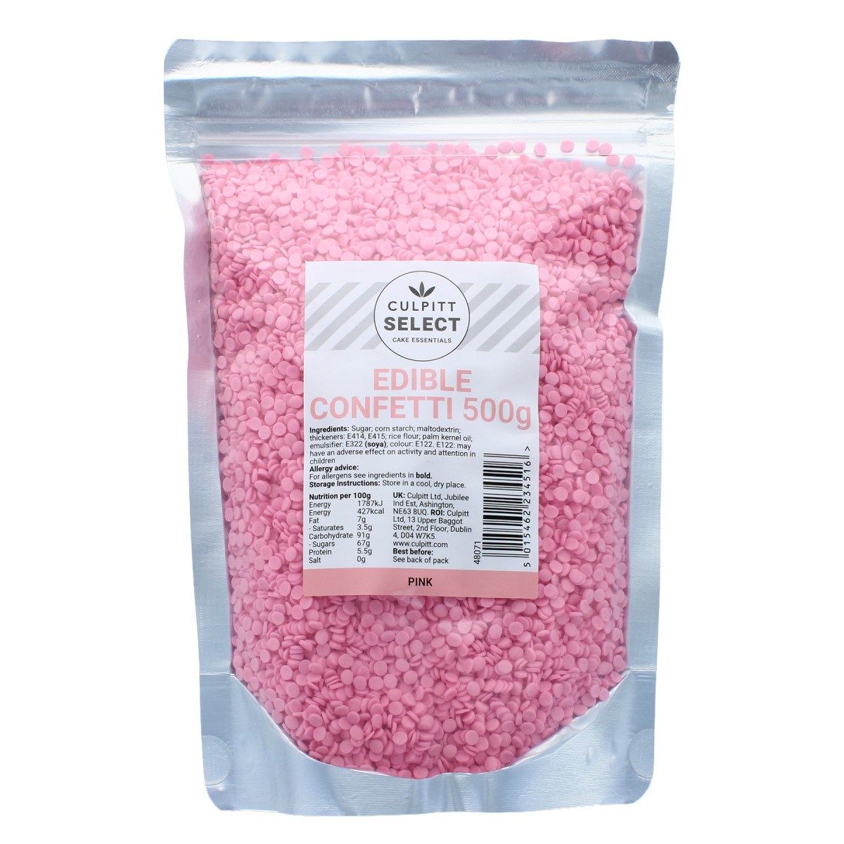 Culpitt Select pink confetti sprinkles are a quick, cost-effective cake topping for professional cake decorating. They are often combined to make a rainbow confetti mix.