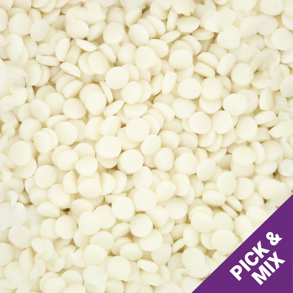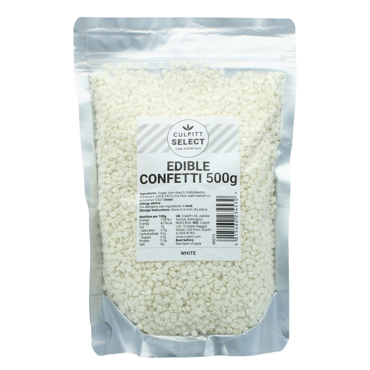 Culpitt Select white confetti sprinkles are a quick, cost-effective cake topping for professional cake decorating. They are often combined to make a rainbow confetti mix.