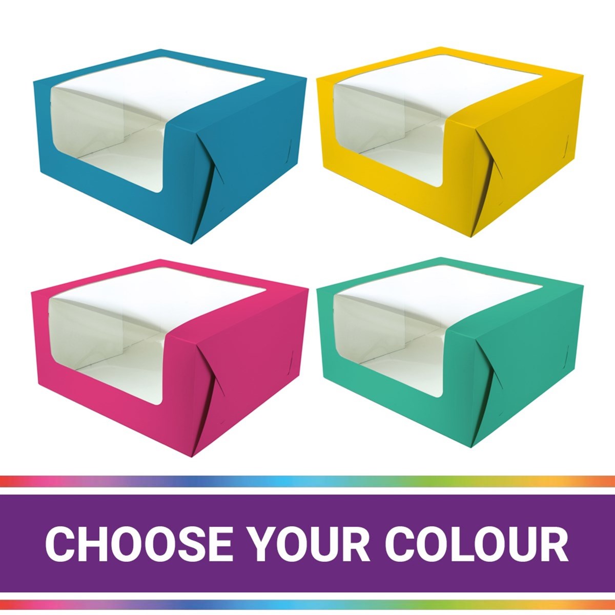 Transport and present your cakes and tasty treats in style with these 10" brights windowed cake boxes. These bright, colourful, cake boxes features a clear acetate window on the top and front of the box to show off your decorated cakes and desserts.