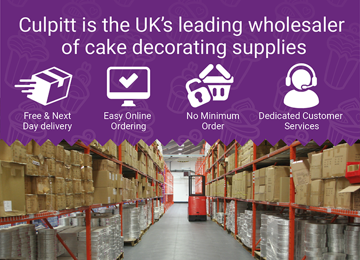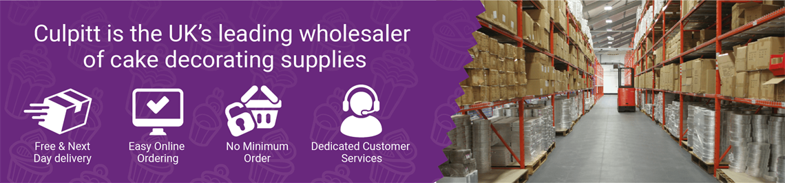 Culpitt is the UK’s leading wholesaler of cake decorating supplies.   We offer everything you need for your cake decorating or bakery business from decorations to equipment, ingredients to cake boards, in bulk or single packs, all at the best trade prices.  We stock all the leading brands such as Renshaw, Rainbow Dust, PME, Sugarflair, Pavoni, FMM, ColourSplash®, Saracino, Baked with Love, House of Cake®, Cake Star and Wilton.  We also supply PhotoCake®, the world’s leading edible printing system.   Our range is the largest in the UK and our prices hard to beat.   We offer both free and next day delivery and ship all around the world.   If you are in the business of cake decorating, we would love to hear from you.