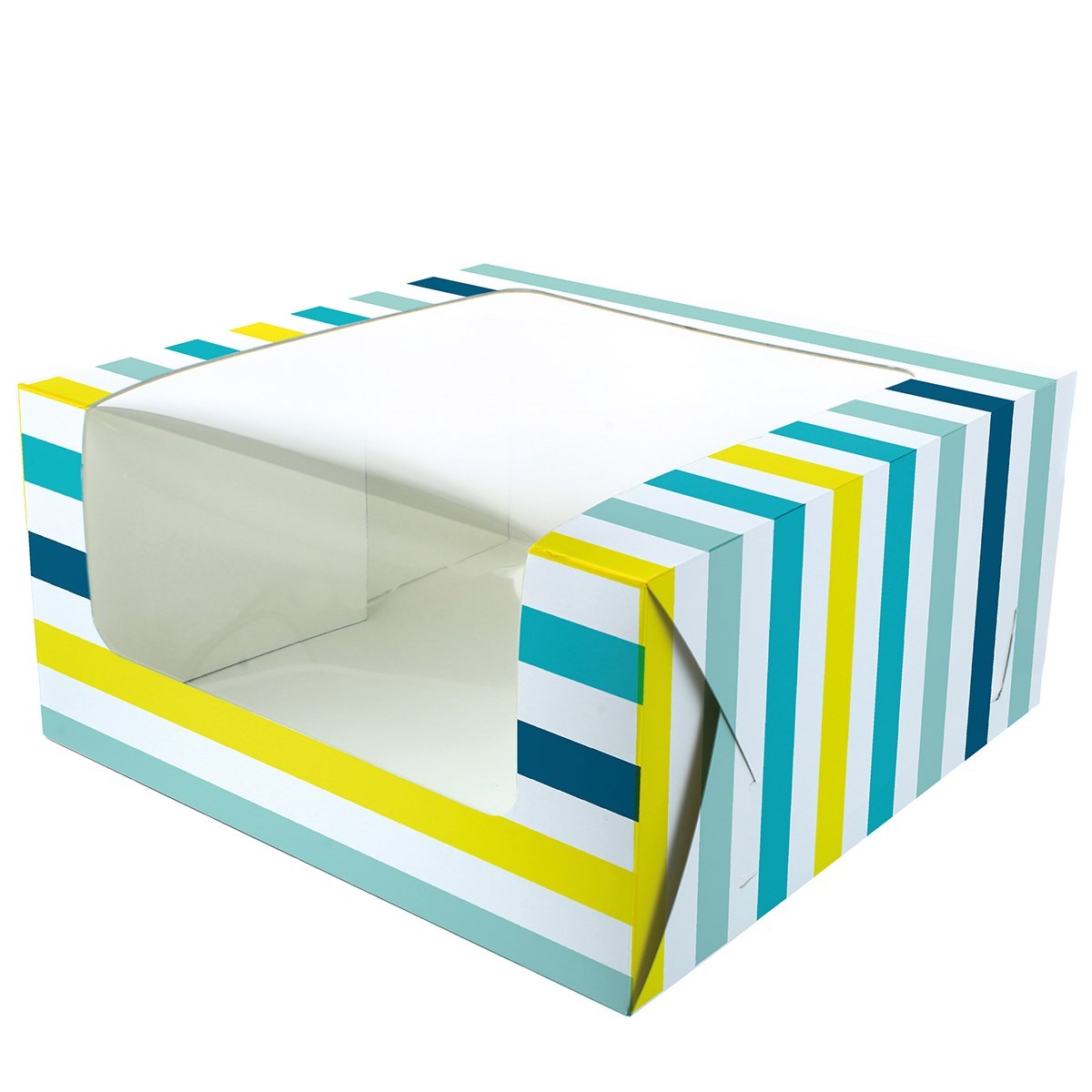 Teal Bold Stripes 10" Windowed Cake Box - Take your presentation to the next level, these cake boxes are ideal for displaying cakes in stores, bakesales, and coffee mornings. Boxes have a top and front transparent window so you can easily see inside. Sure to enhance the look of your decorative cakes, desserts, puddings, and pies for display or gifts. Boxed 20.