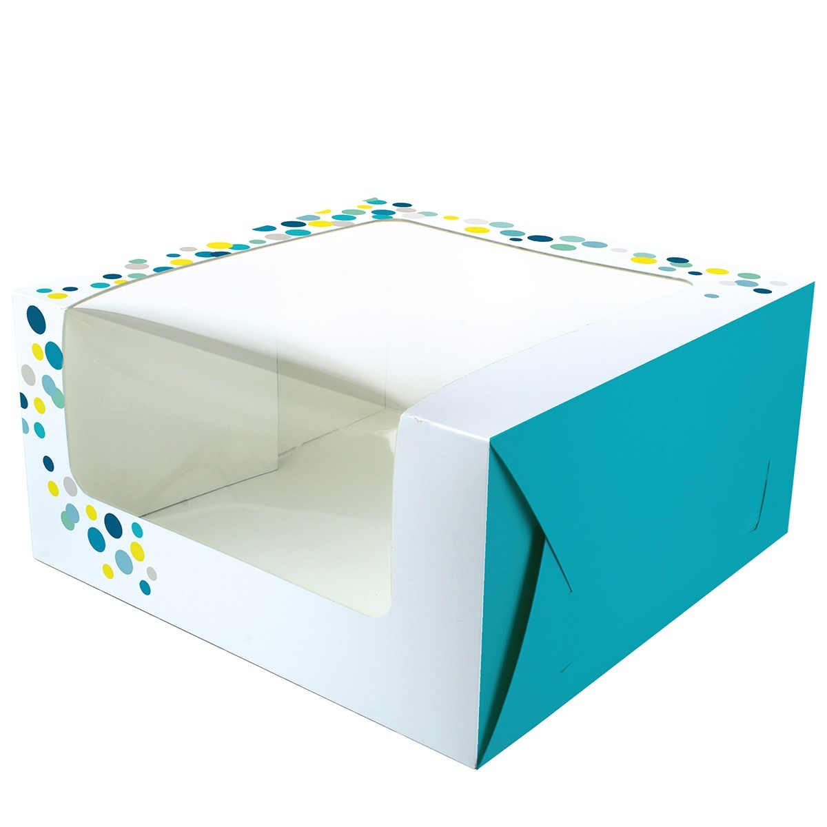 Teal Confetti 10" Windowed Cake Box - Take your presentation to the next level, these cake boxes are ideal for displaying cakes in stores, bakesales, and coffee mornings. Boxes have a top and front transparent window so you can easily see inside. Sure to enhance the look of your decorative cakes, desserts, puddings, and pies for display or gifts. Boxed 20.