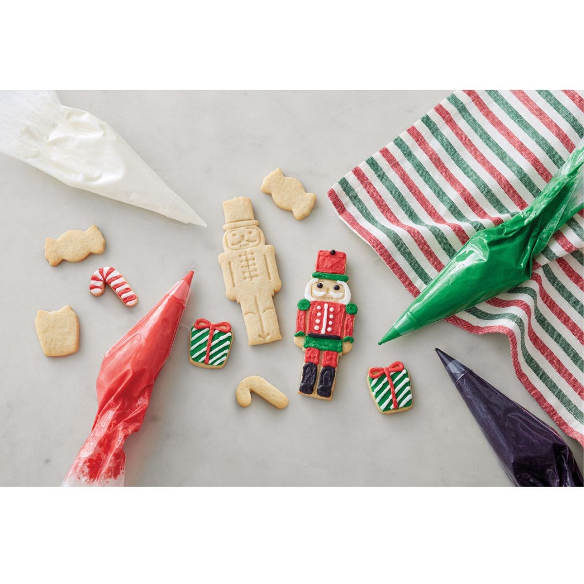 The set also includes cutters in the shape of a candy cane, gift and wrapped candy, plus 4 disposable piping bags and plastic tips to make decorating fun.