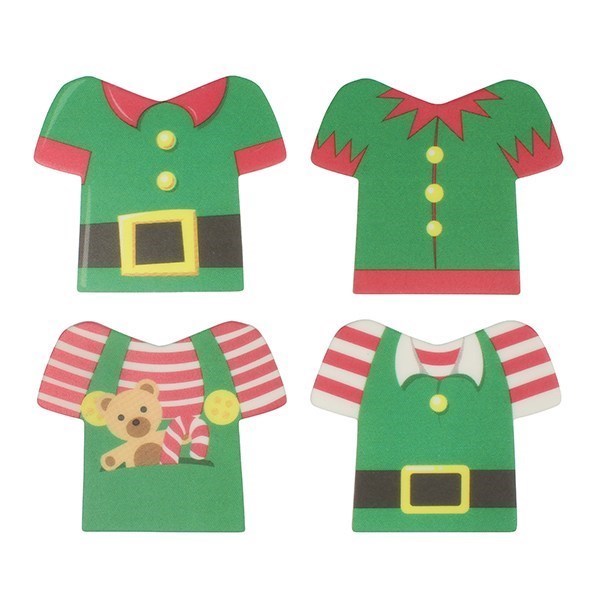 Brighten your festive cakes with these adorable red & green elf jacket sugar plaques. Includes 4 different designs of jackets, perfect for decorating Christmas cakes, cupcakes and biscuits with children!