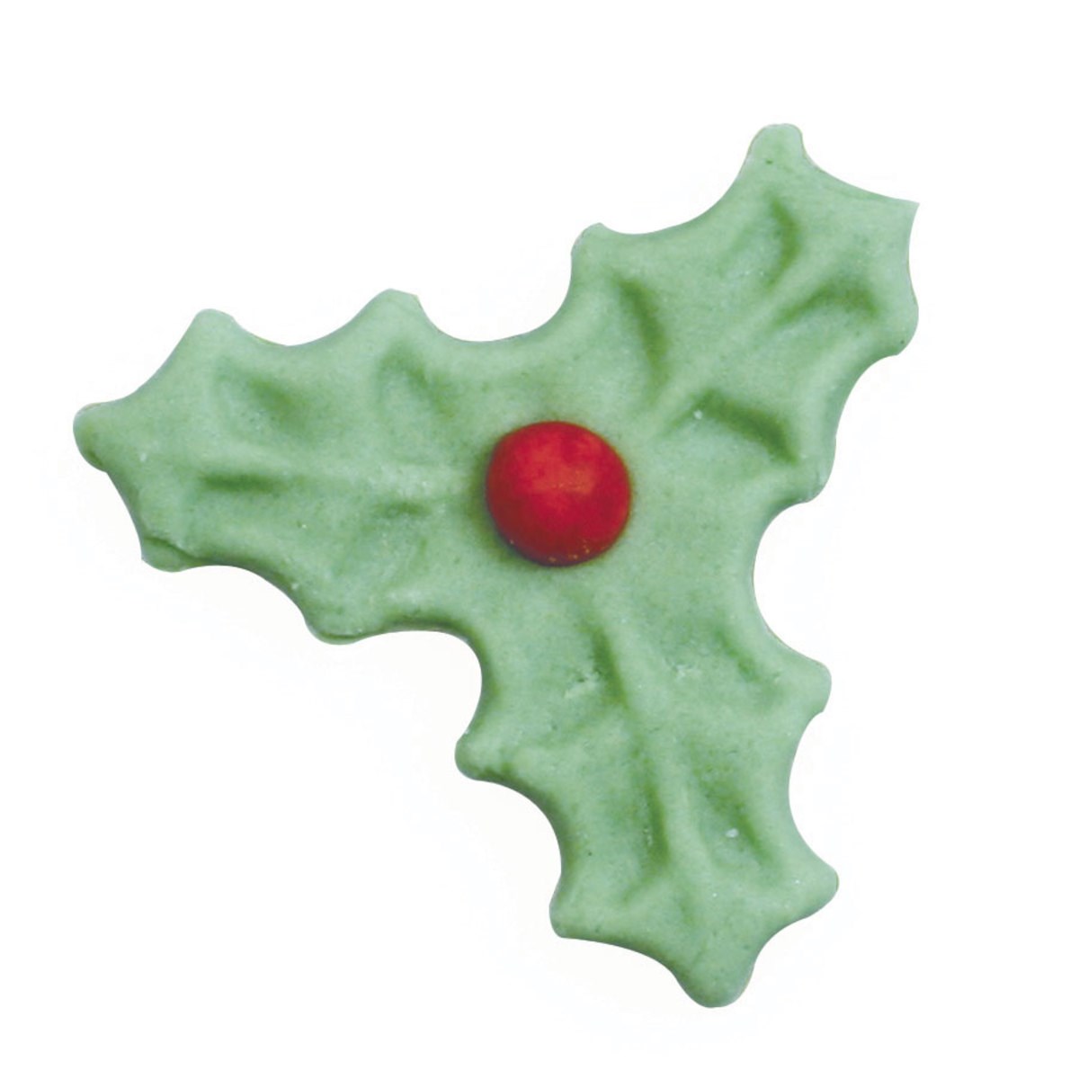 These classic triple holly cake decorations are made from green sugar paste with embossed veins and a hand-piped red berry. This product is edible and has been coloured using food colours which are not azo free.