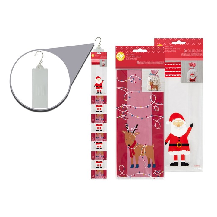 Wilton Santa and Reindeer treat bags on clipstrips provide easy hanging for your shop displays which gives you more shelf space! Each clipstrip contains 12 packs of treat bags (6 Christmas Santa and 6 Reindeer) and can be removed easily!
