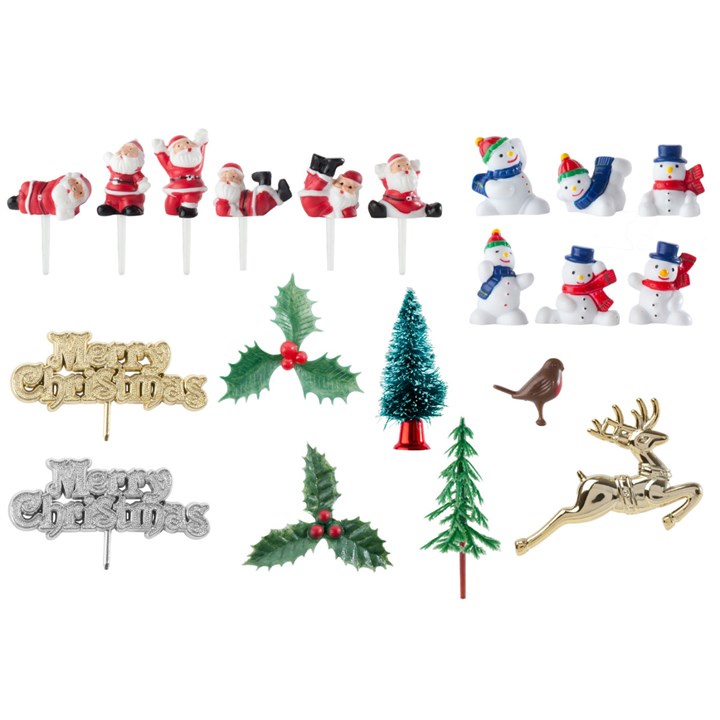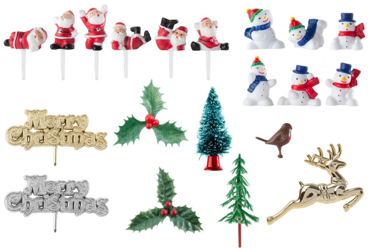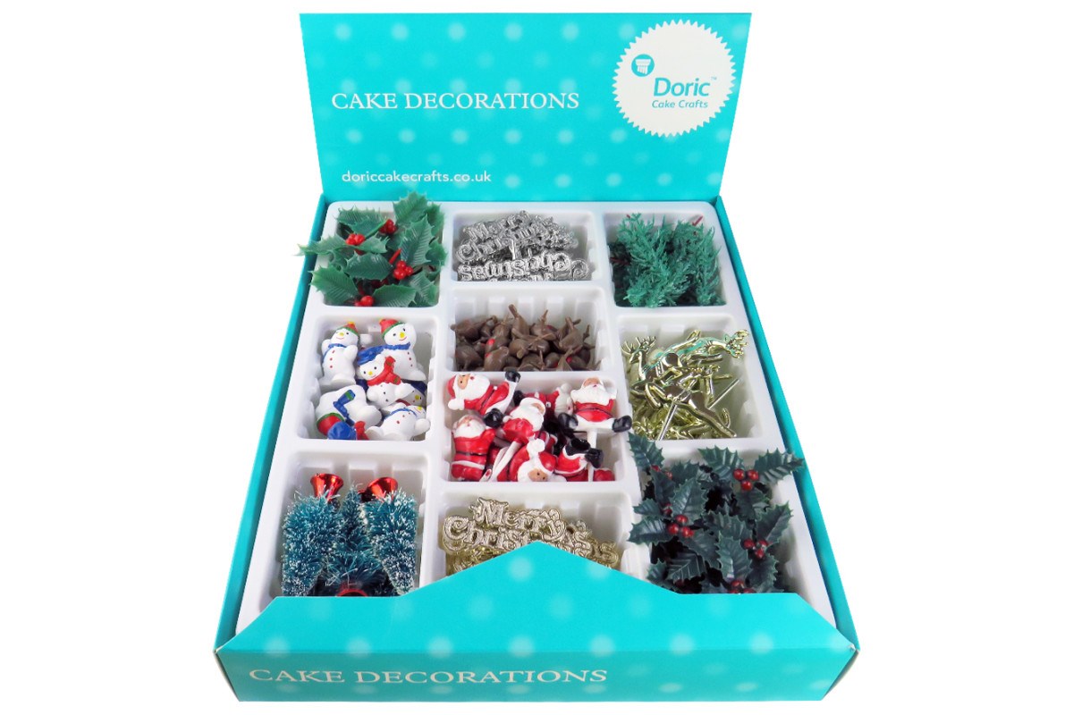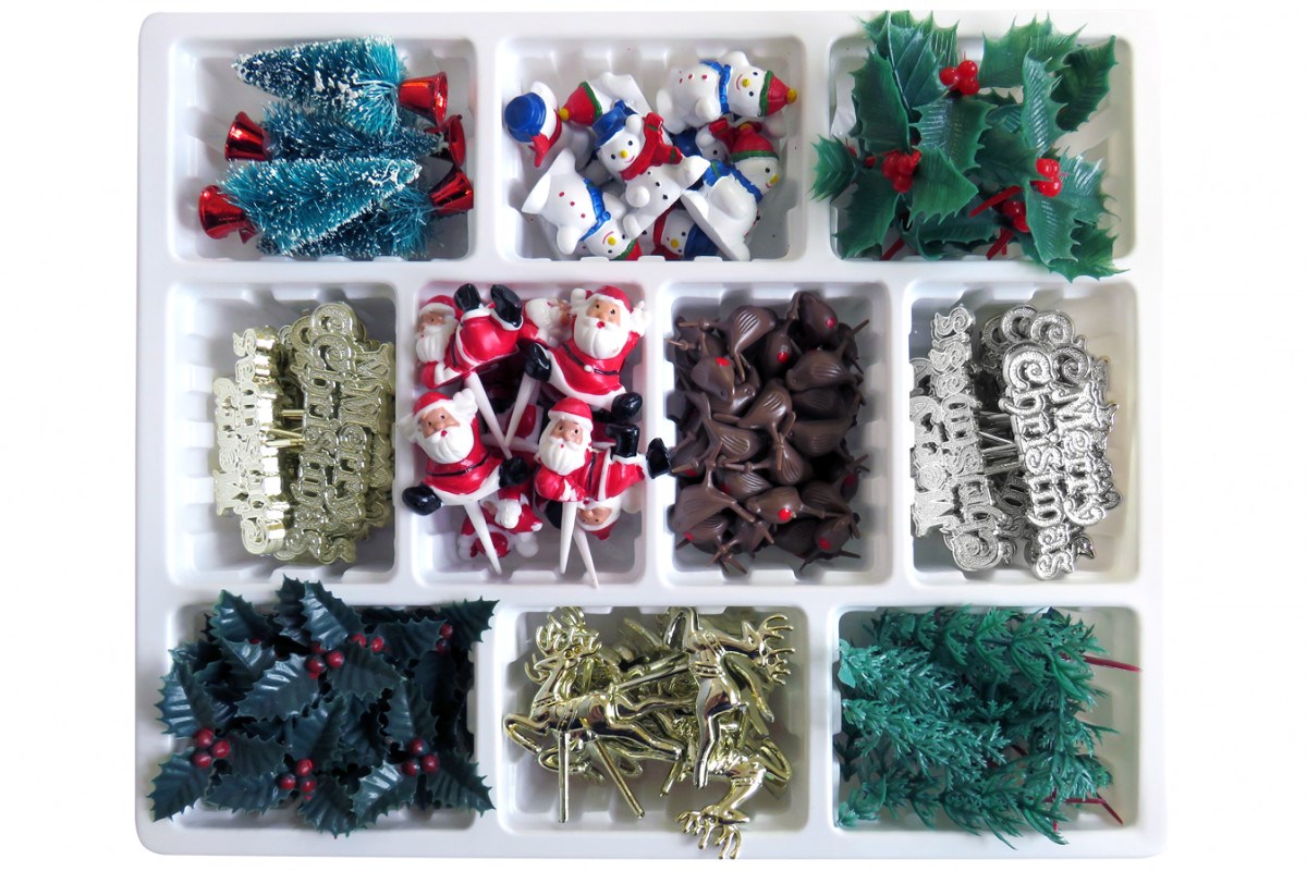 Wholesale display box, comprising of an assortment of festive, Christmas themed plastic cake decorations. Display box with decorations from our popular selection including mottos, robin on a peg, leaping deer and of course some festive holly!