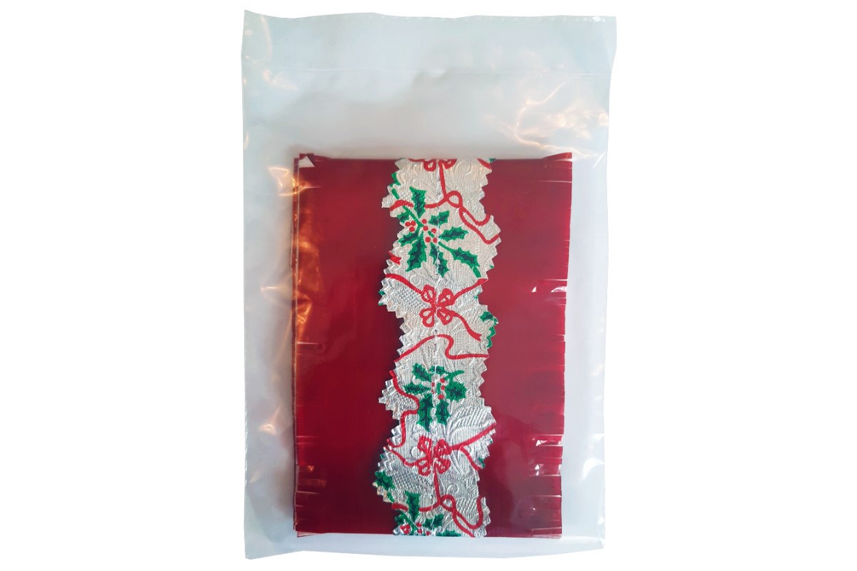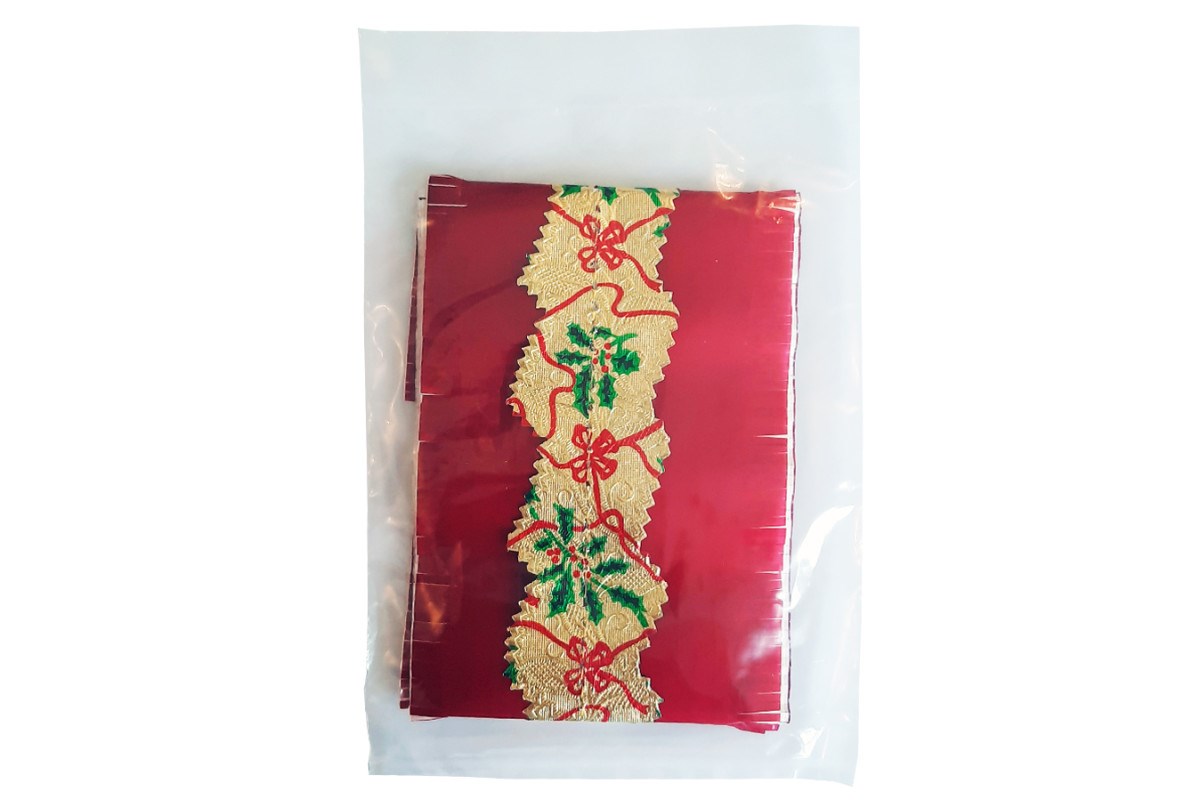 An assortment of traditional cake frills in red with either gold or silver centre bands with holly and bow design. Each frill is bagged and packed into a display box. They comprise grease resistant paper, tissue and frilled cellophane, with a foil centre band.