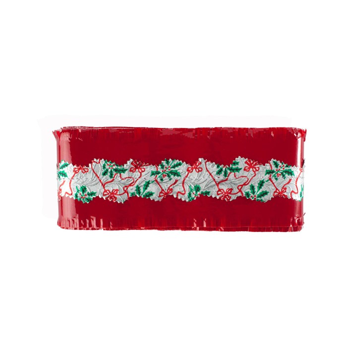 This traditional frill in red with a holly and bow design is perfect for finishing a Christmas cake. It comprises grease resistant paper, tissue and frilled cellophane, with a silver foil centre band.