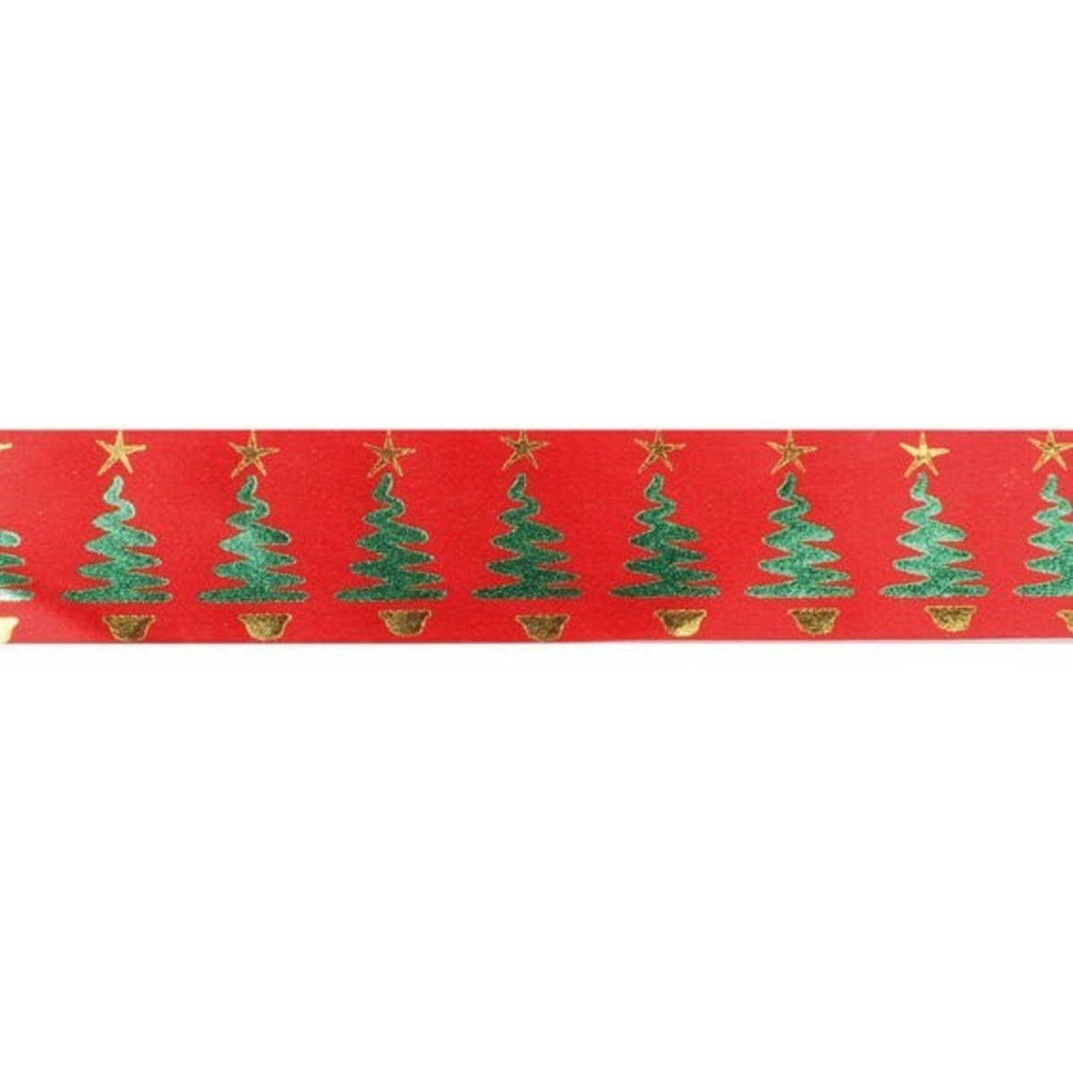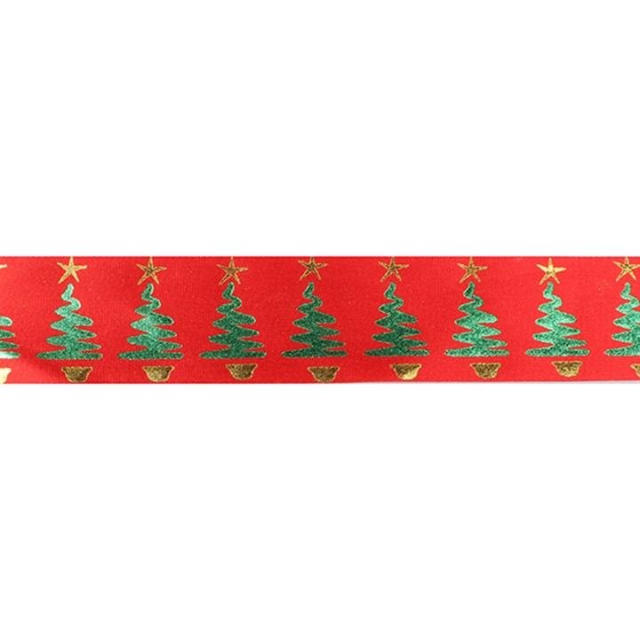A high quality cut edged red, green and gold festive ribbon with pretty modern Christmas trees in a metallic green with gold trimmings.