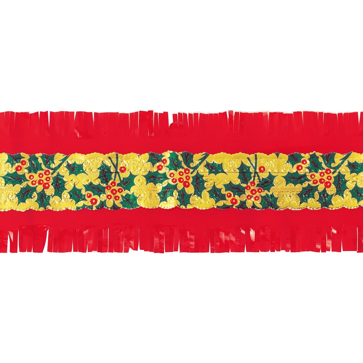 This Frill is made from a paper backed, opaque red plastic film, with a gold coloured foil central and which has been printed with a holly design and embossed to give a surface texture. Both sides of these Frills are fringed. This Frill is 64mm wide. (Boxed 22m approximately).