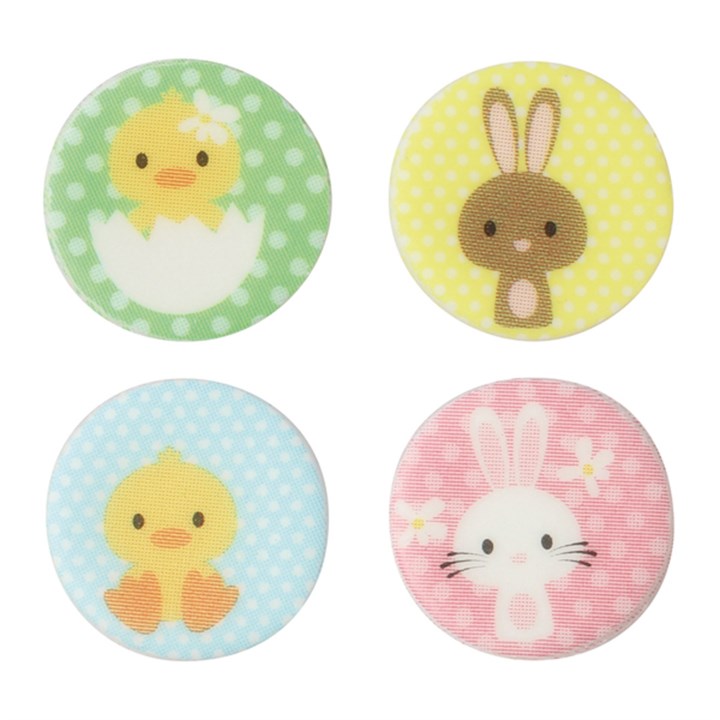 These decorations feature cute bunnies and chicks on colourful backgrounds.