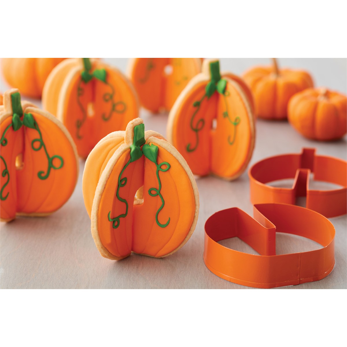 Make 3D pumpkin cookies that stand up on their own with this set of cookie cutters. Includes 2 interlocking pieces.