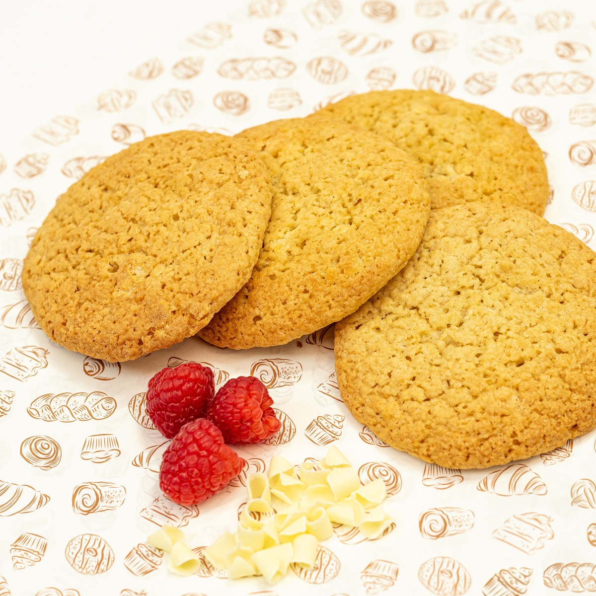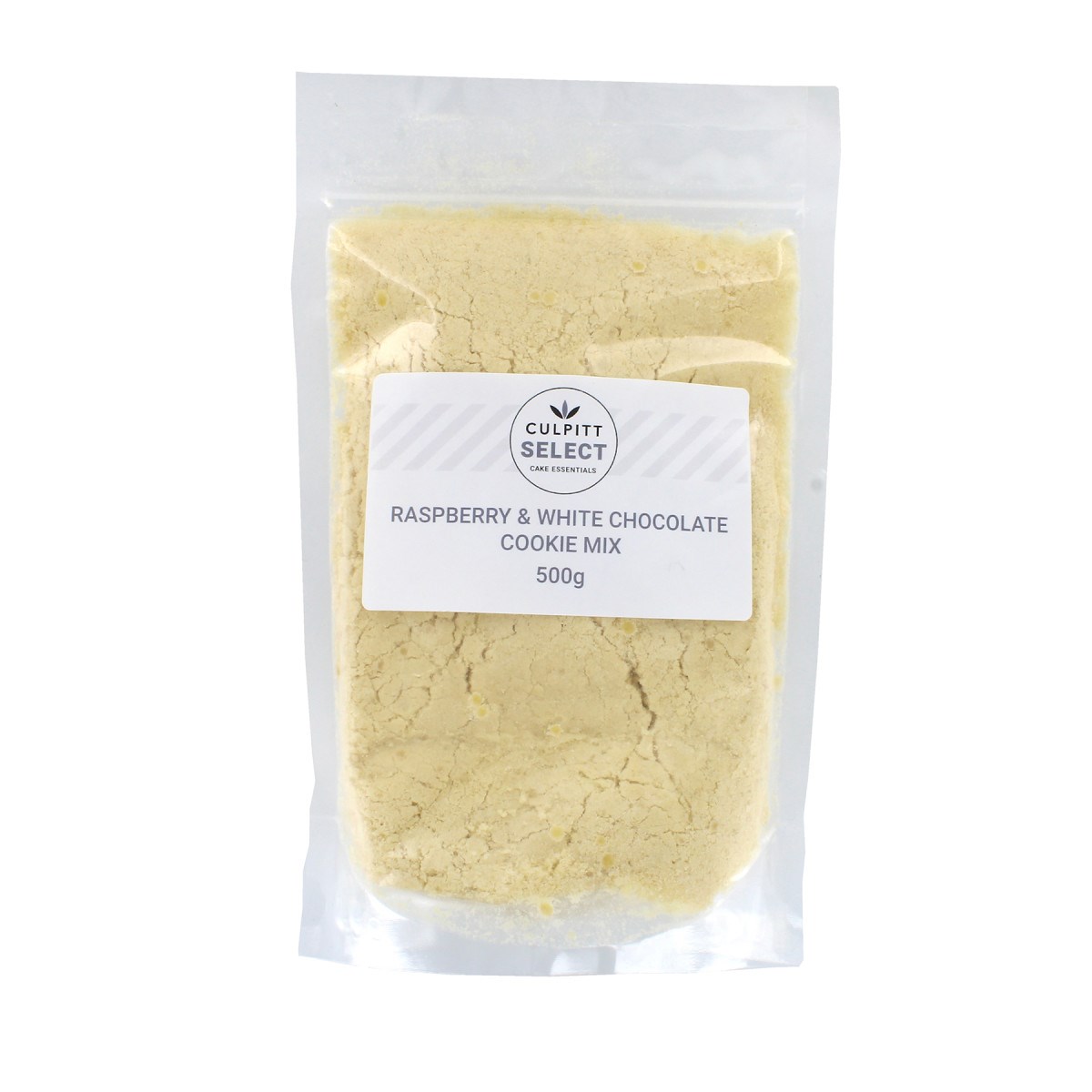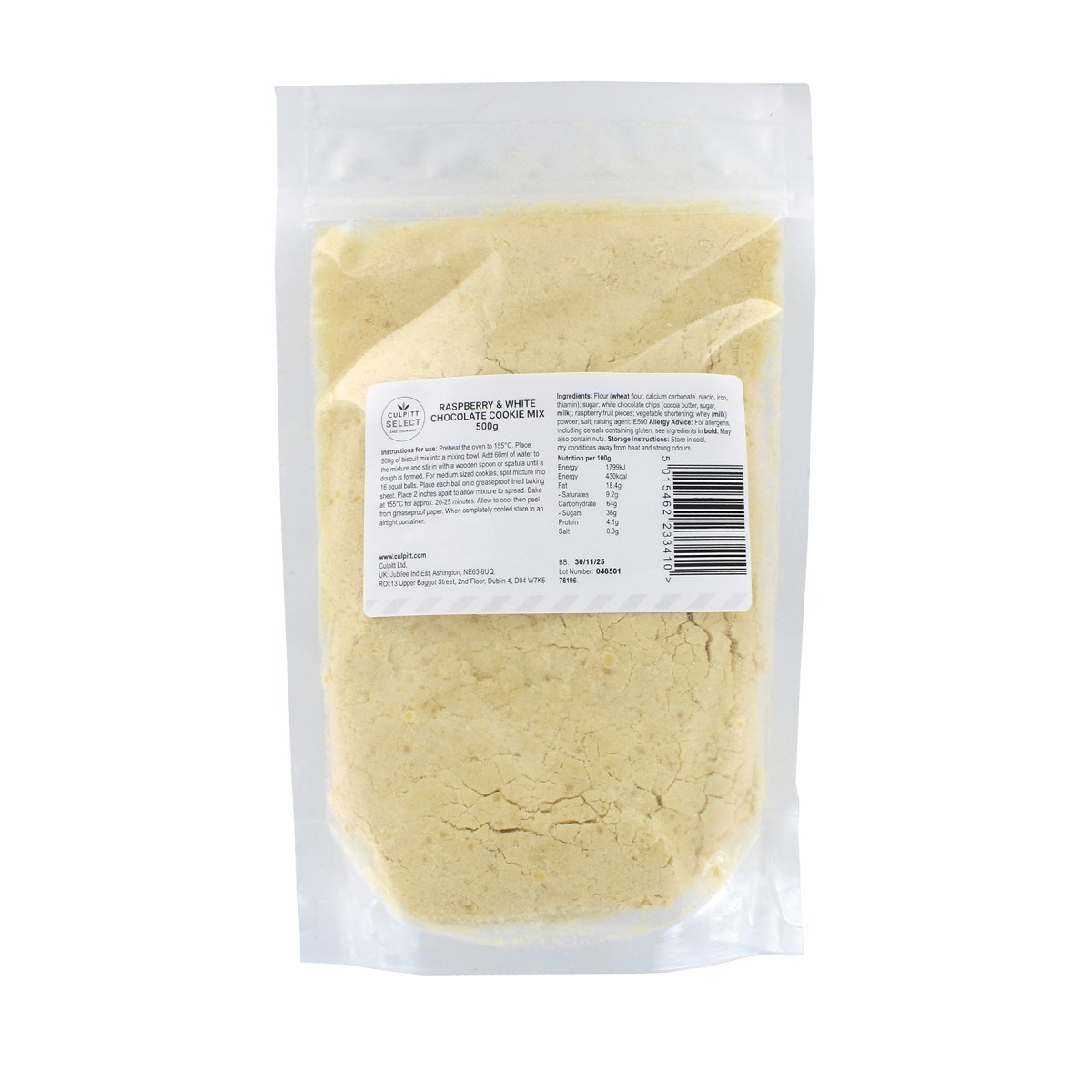 Flour (WHEAT flour, calcium carbonate, niacin, iron, thiamin); sugar; white chocolate chips (cocoa butter, sugar, MILK); raspberry fruit pieces; vegetable shortening; whey (MILK) powder; salt; raising agent: E500