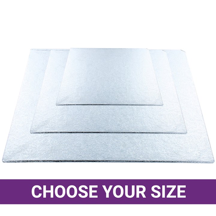 These 3mm thick, Square Cake Boards have a strong, hardboard centre, making them ideal for use with heavier fruit cakes. The top and sides of the Cake Board are covered with a silver coloured, embossed foil and there is a white backing paper on the reverse.