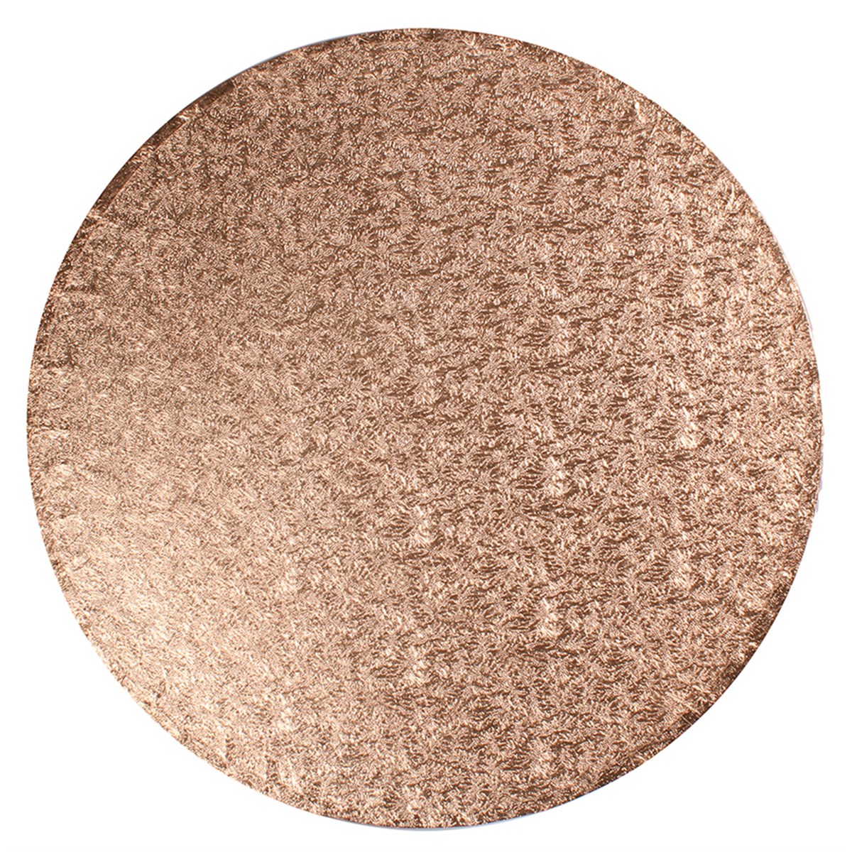 Sometimes referred to as a Cake Drum, this is the strongest type of Cake Board. It has a bonded fibre board inner which is covered on the top and sides with a textured, copper coloured foil and with white paper on the base. The finished Cake Board is 0.5'' (13mm) thick, with a 12'' (304mm) round top.