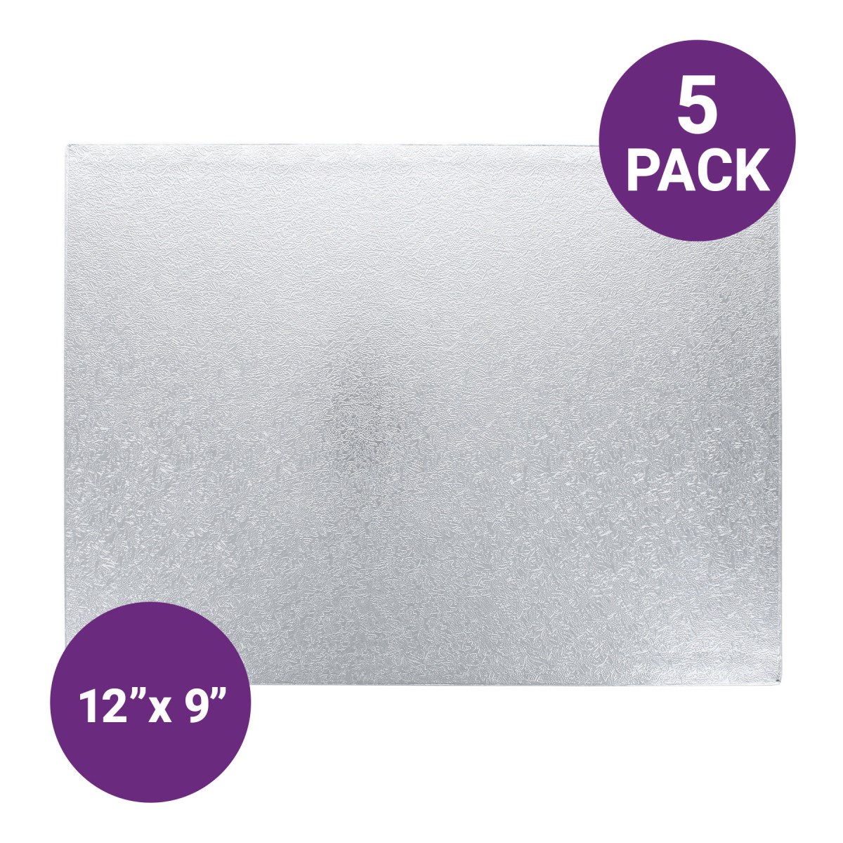 Standard 12"x 9" rectangular silver cake boards for everyday professional cake presentation. Wholesale bulk packs of 5 boards, ideal for small businesses, bakery and catering companies seeking cost-effective traditional cake display and transportation with a quality finish. They are also suitable for retail re-sale.