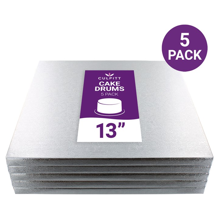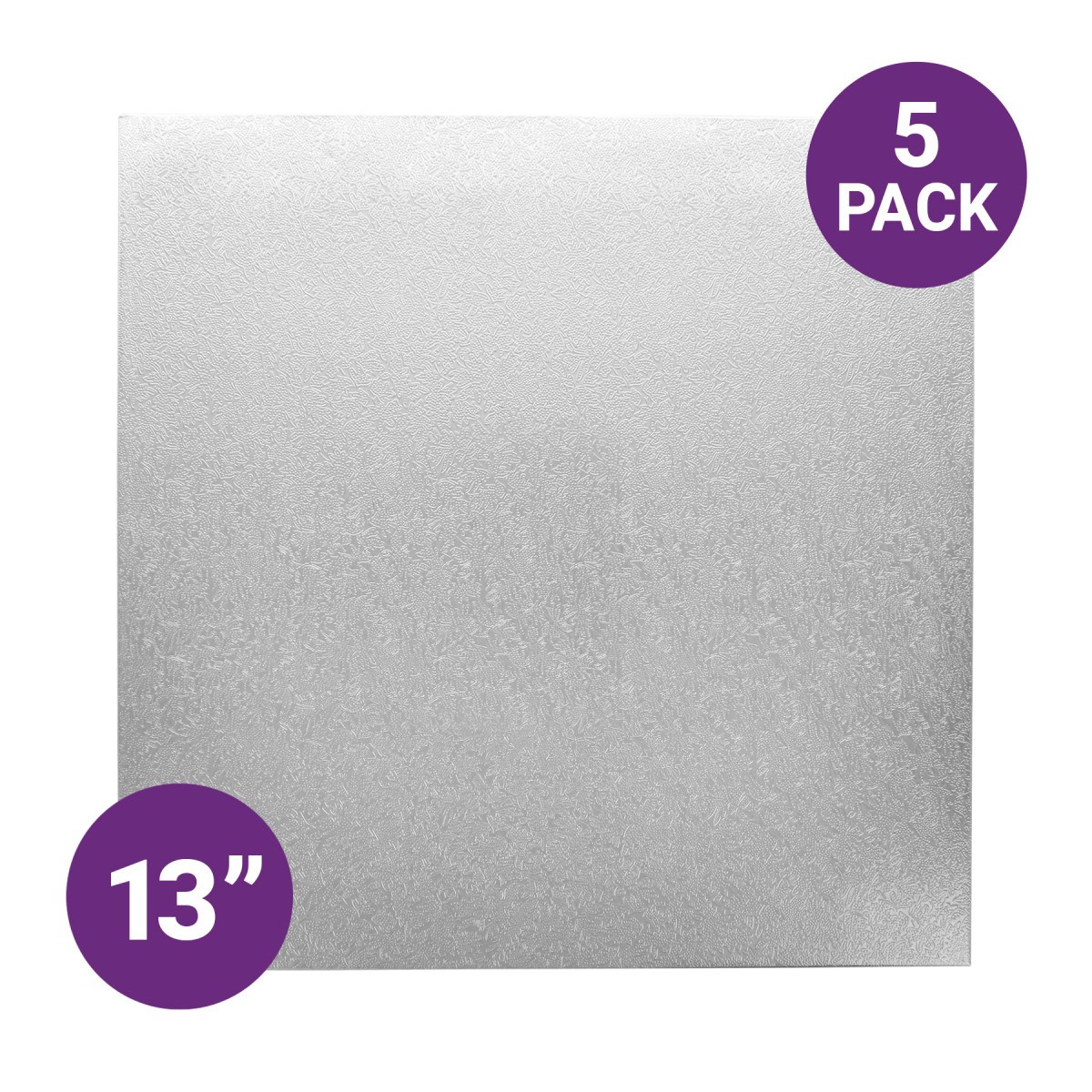 Standard 13" square silver cake boards for everyday professional cake presentation. Wholesale bulk packs of 5 boards, ideal for small businesses, bakery and catering companies seeking cost-effective traditional cake display and transportation with a quality finish. They are also suitable for retail re-sale.