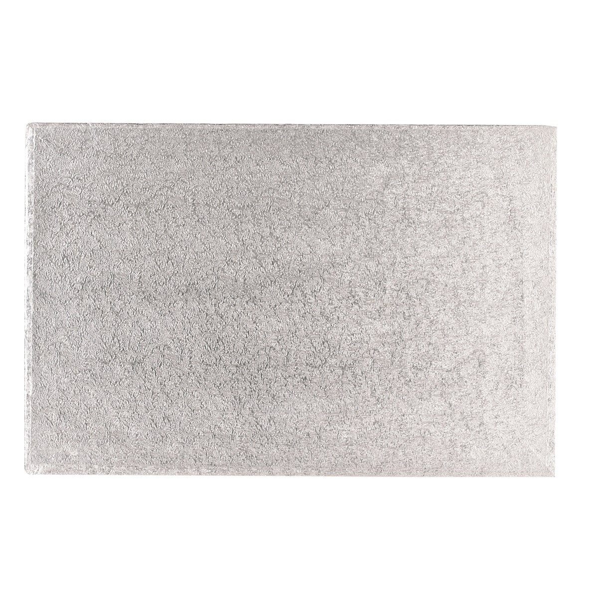 Sometimes referred to as a Cake Drum, this is the strongest type of Cake Board. It has a bonded fibre board inner which is covered on the top and sides with a fern textured, silver coloured foil and with white paper on the base. The finished Cake Board is 0.5'' (13mm) thick, with a 14 x 10'' (355 x 254mm) oblong top.