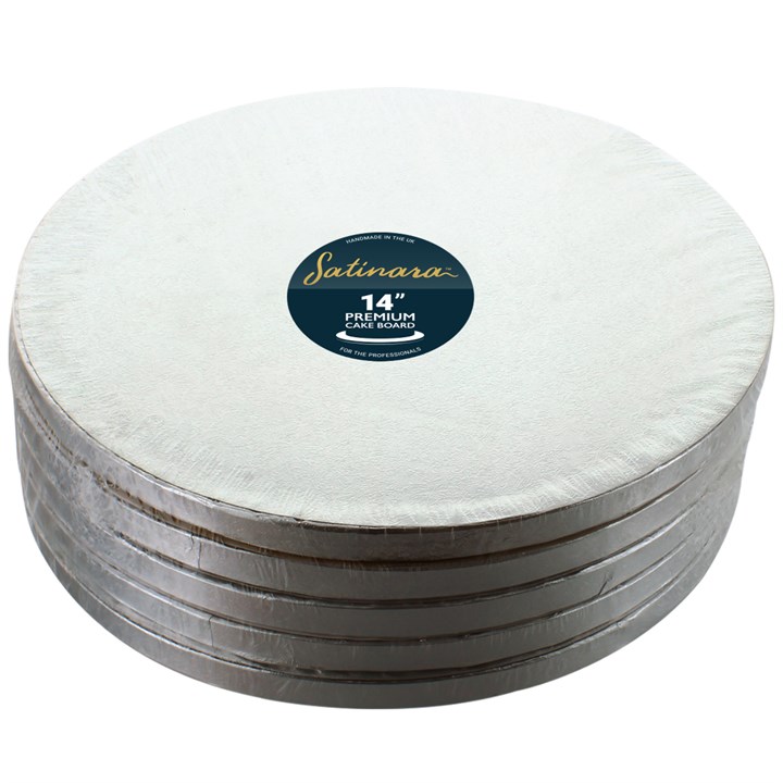 14" round (355mm round) silver cake boards, supplied here shrink wrapped in wholesale bulk packs of 5. Please note each board is not individually wrapped.