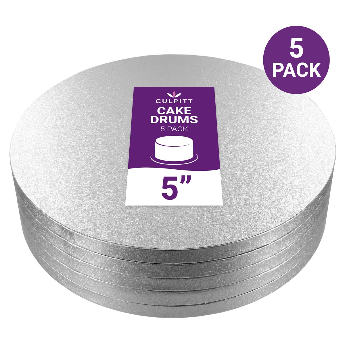 Standard 5" round silver cake boards for everyday professional cake presentation. Wholesale bulk packs of 5 boards, ideal for small businesses, bakery and catering companies seeking cost-effective traditional cake display and transportation with a quality finish. They are also suitable for retail re-sale.