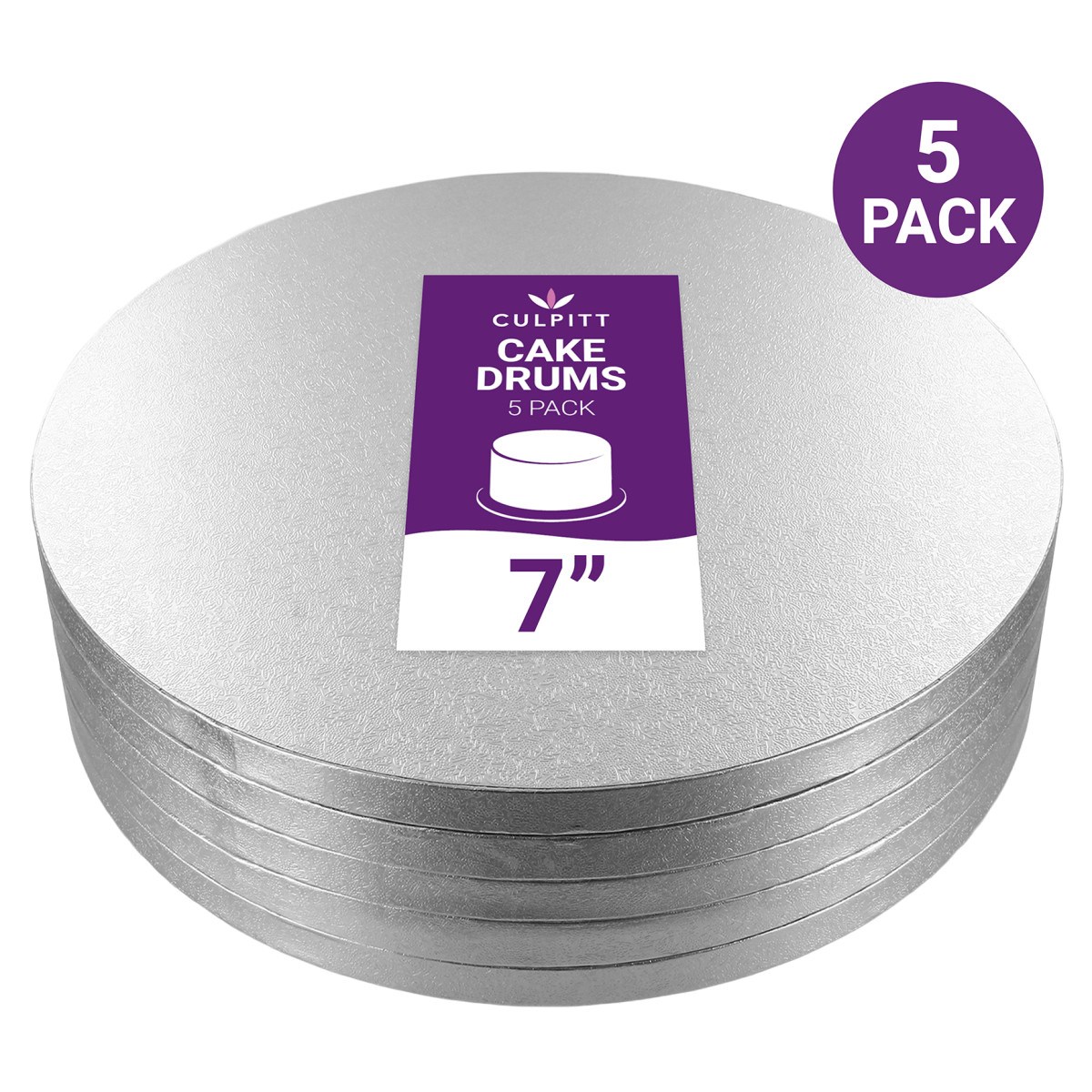 Standard 7" round silver cake boards for everyday professional cake presentation. Wholesale bulk packs of 5 boards, ideal for small businesses, bakery and catering companies seeking cost-effective traditional cake display and transportation with a quality finish. They are also suitable for retail re-sale.
