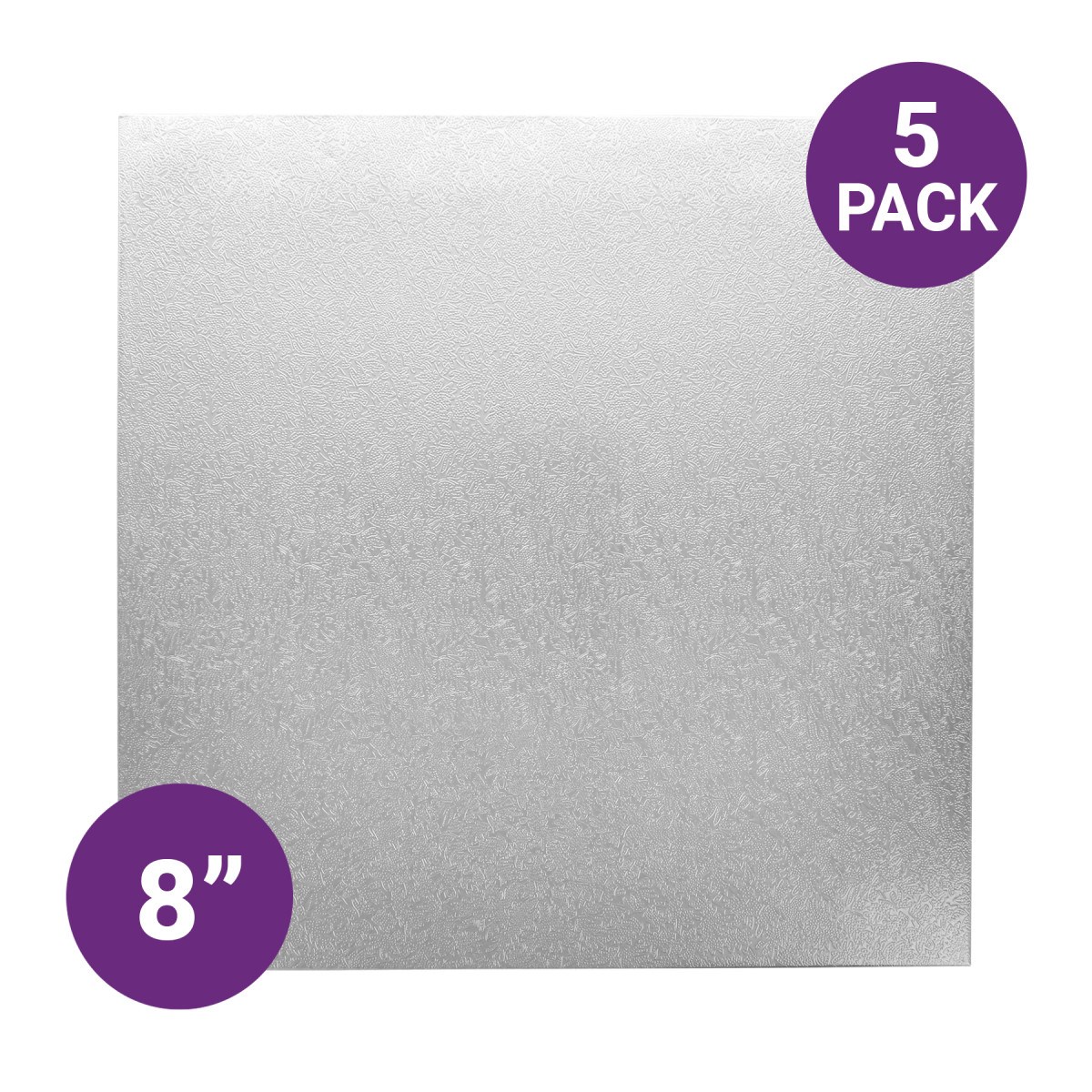 Standard 8" square silver cake boards for everyday professional cake presentation. Wholesale bulk packs of 5 boards, ideal for small businesses, bakery and catering companies seeking cost-effective traditional cake display and transportation with a quality finish. They are also suitable for retail re-sale.