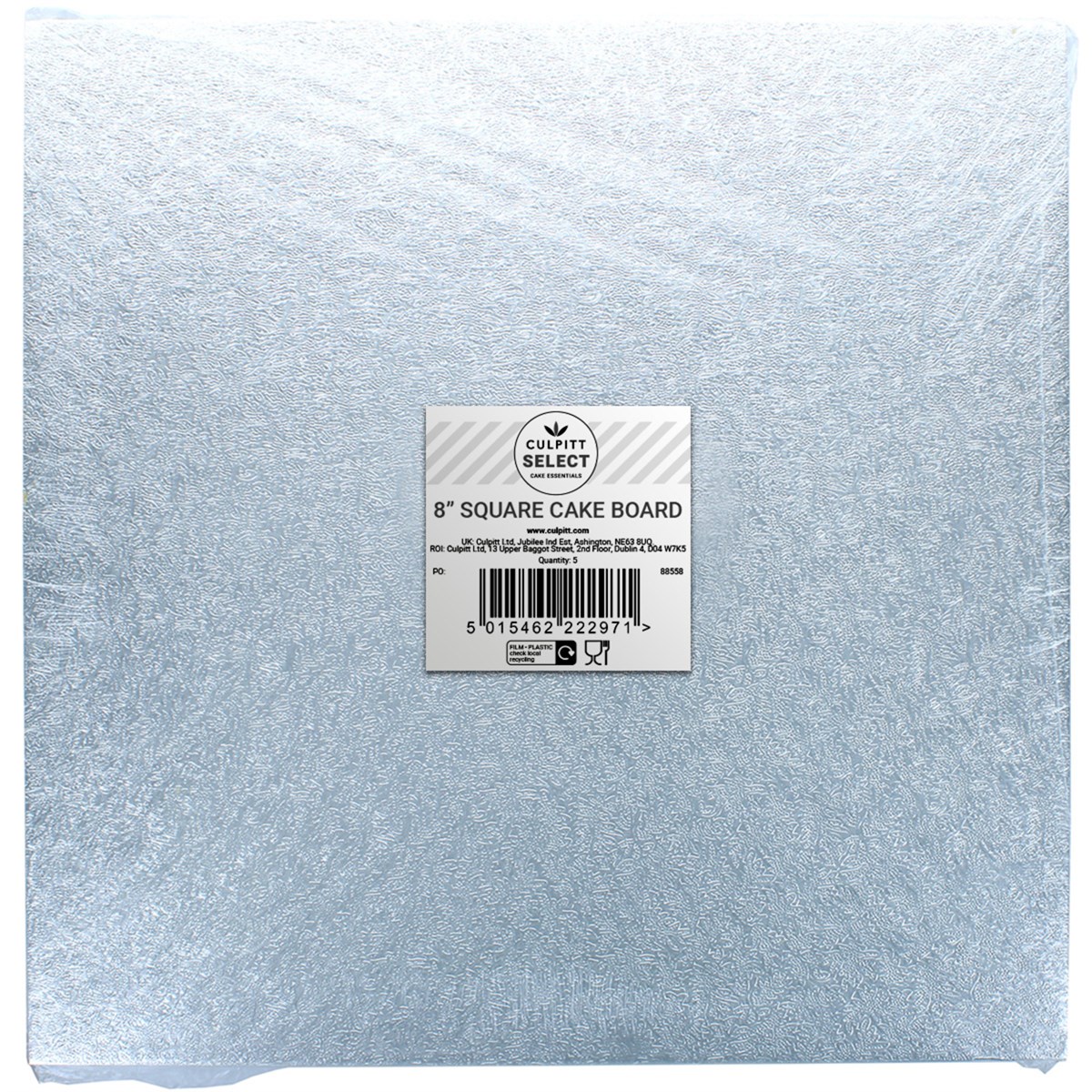 Culpitt Select 8" square cake drums are lightweight, but still reliably strong. 12mm thick and made from tightly fluted corrugated board, they are a great alternative to our standard Culpitt drum. The traditional silver foil turned edge helps display cakes beautifully making them a great value choice both practically and aesthetically.