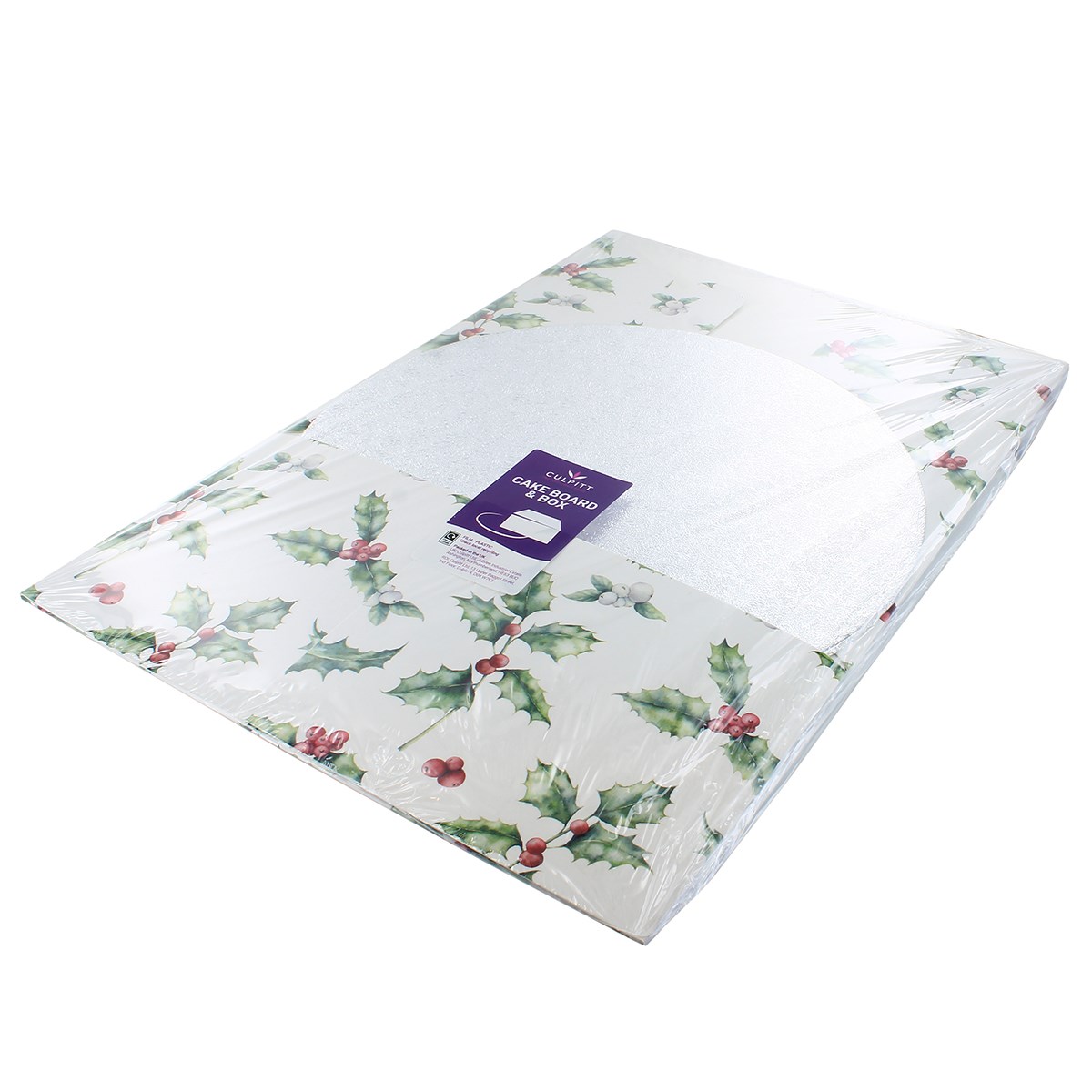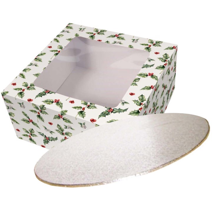 This box and board combination includes a 10" beautifully designed vintage holly window cake box and a 10" round silver cake board, shrink-wrapped together.