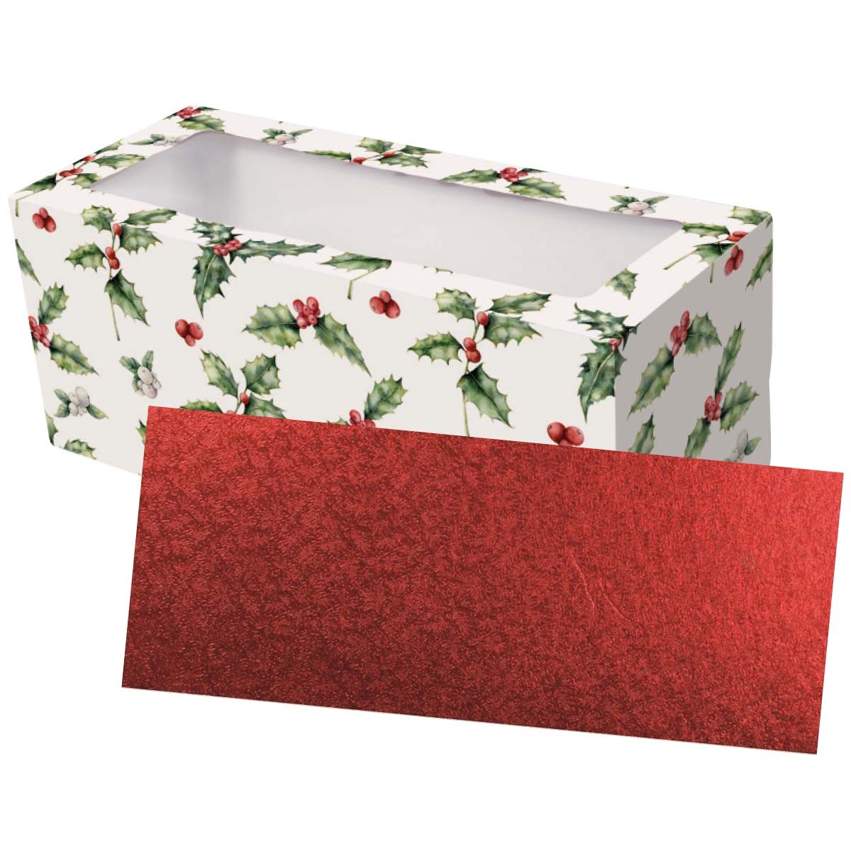 This box and board combination includes a 12 x 5" beautifully designed vintage holly window log cake box and a 3mm red cake board, shrinkwrapped together.