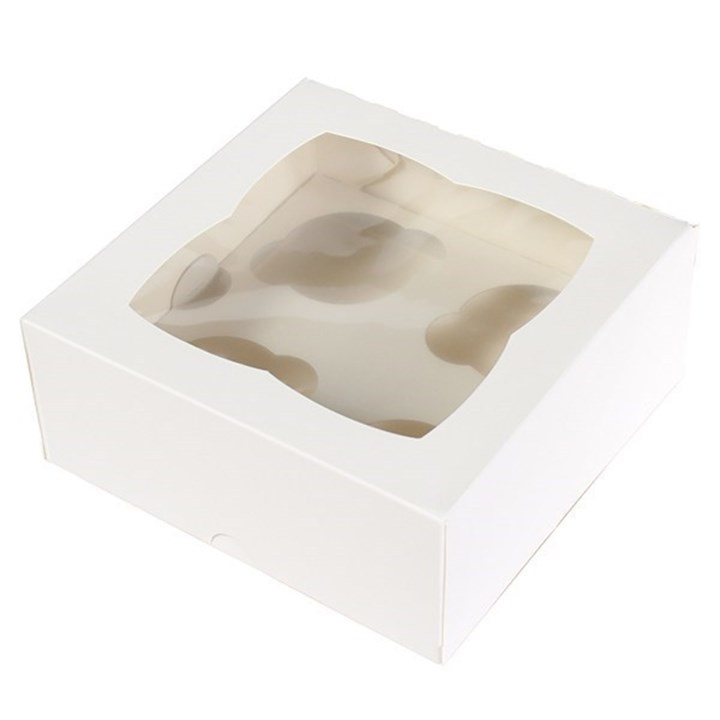 This white 4 cavity cupcake box comes with a transparent lid and an insert to hold the cupcakes in place.
