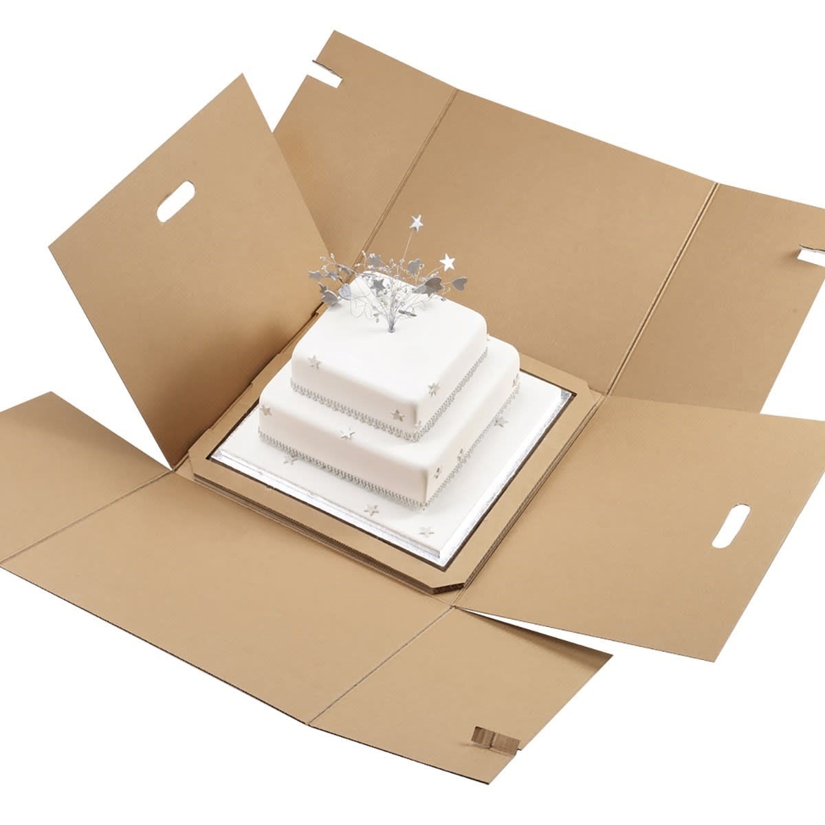 Strong and durable box sized for complete protection for taller cakes. Complete with interchangeable round and square base cards so bottom tier sits snugly in box without moving around. Each base card has a perforated insert so two sizes of cake can fit into each box.