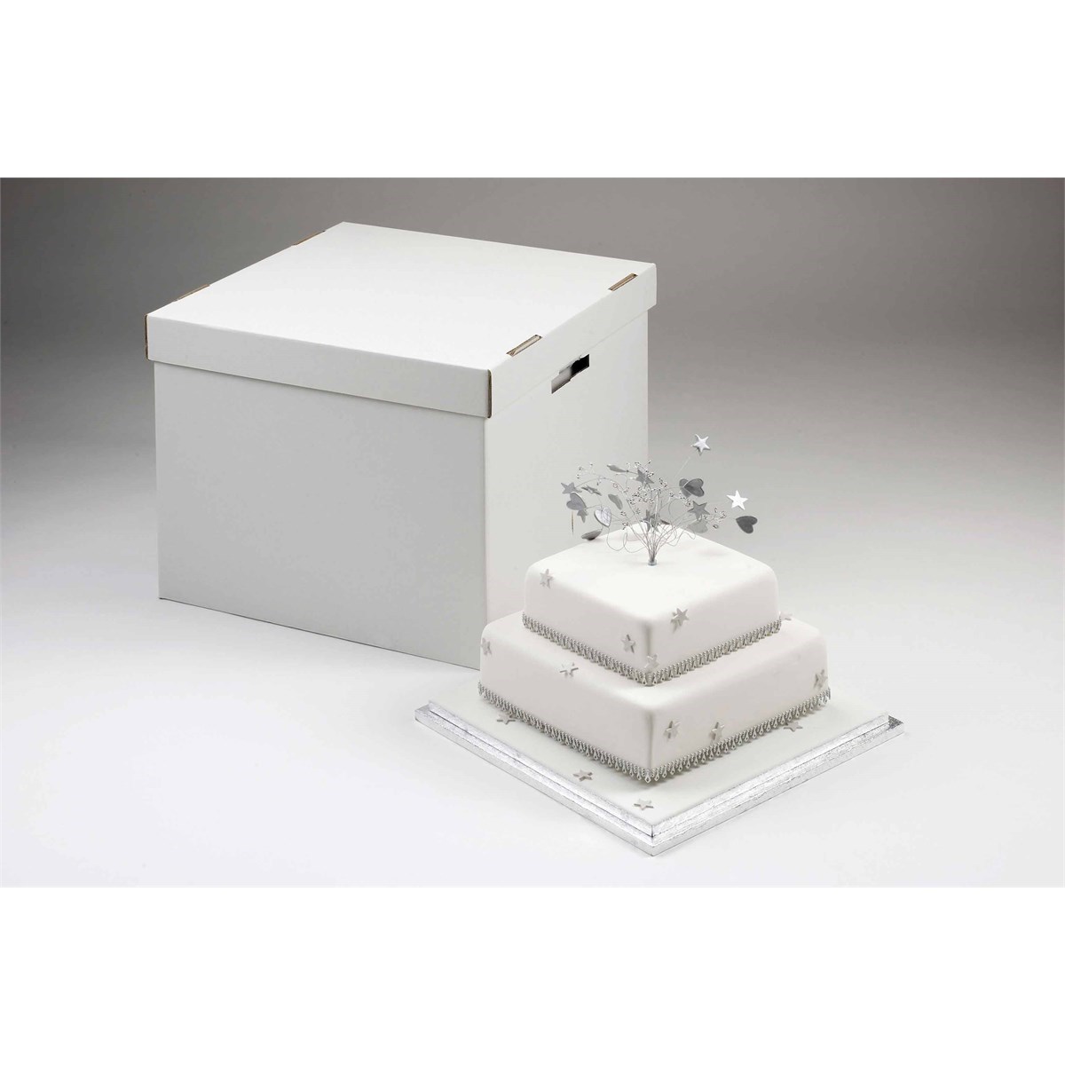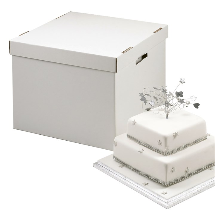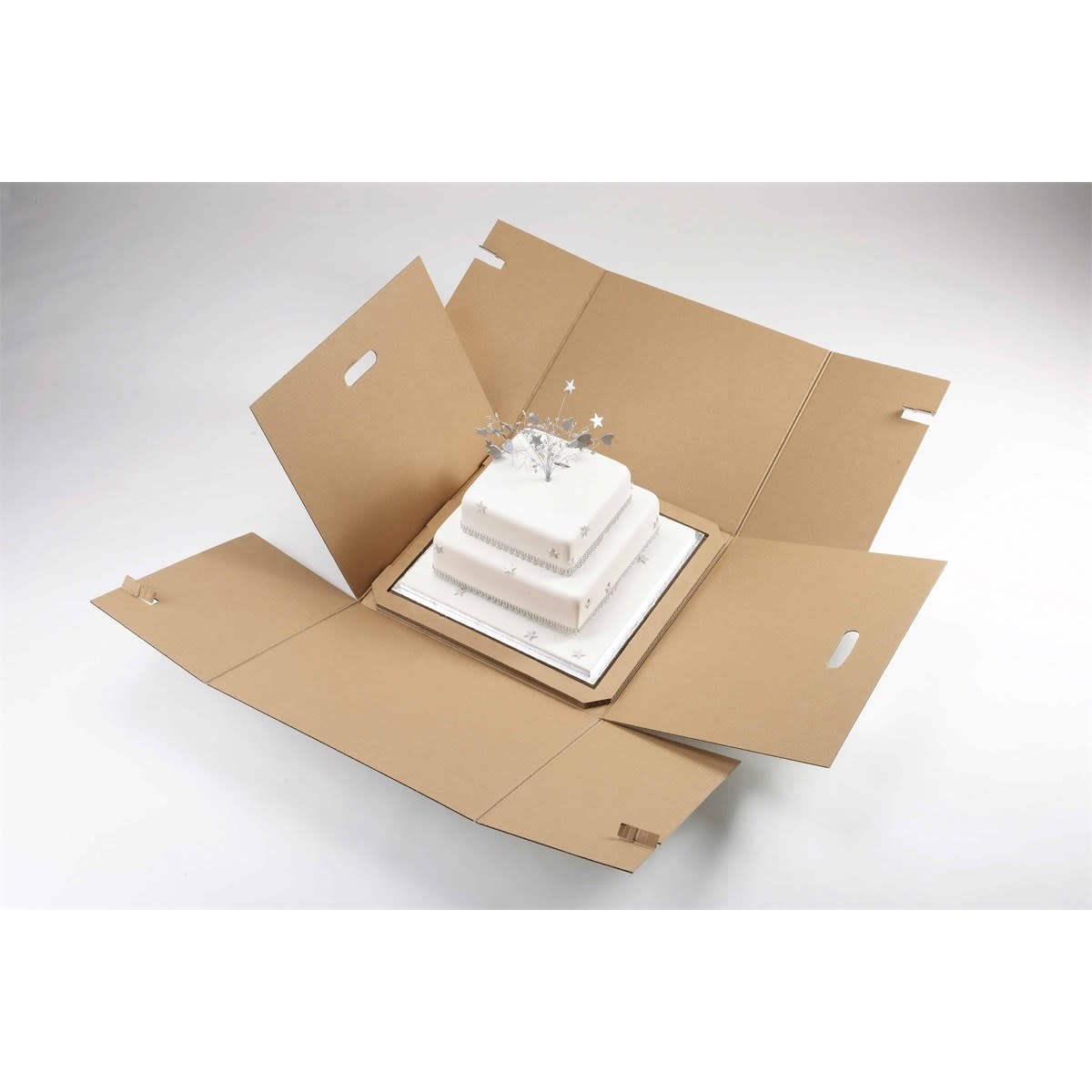 Strong and durable box sized for complete protection for taller cakes. Complete with interchangeable round and square base cards so bottom tier sits snugly in box without moving around. Each base card has a perforated insert so two sizes of cake can fit into each box.