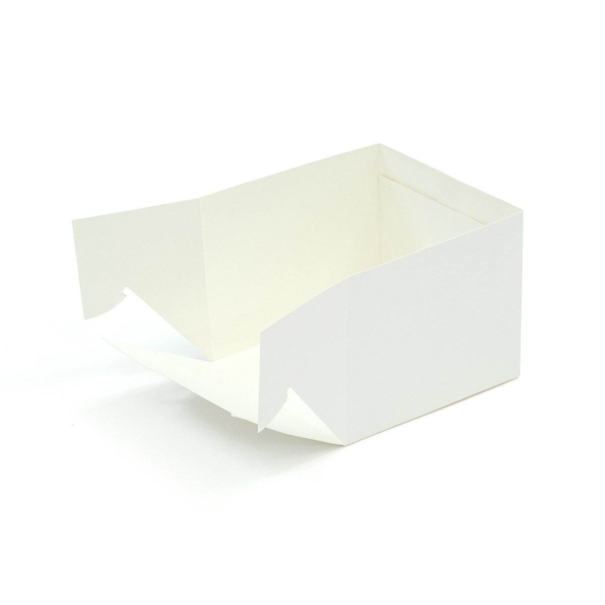 These white cake boxes with lids come folded and flat packed for convenient storage. The box bases are quick and easy to assemble. The pre-glued lids fit perfectly on top.