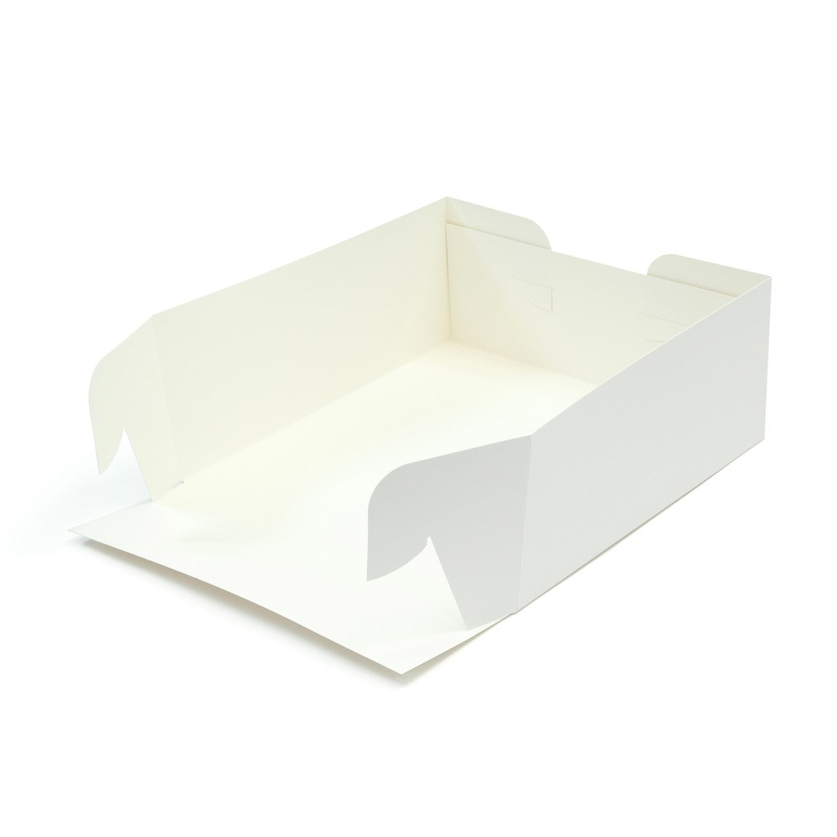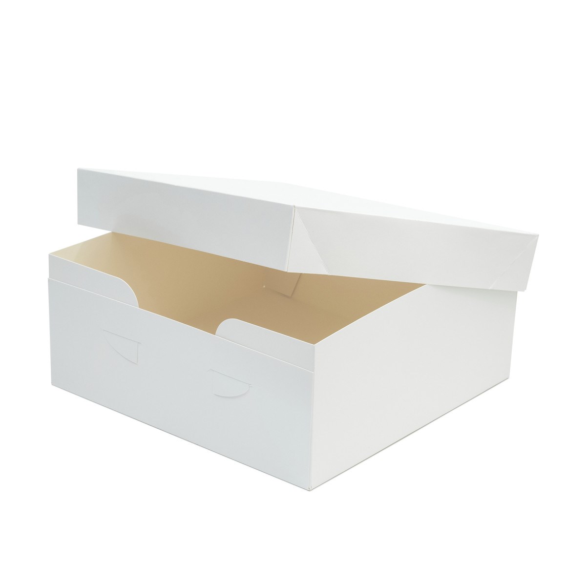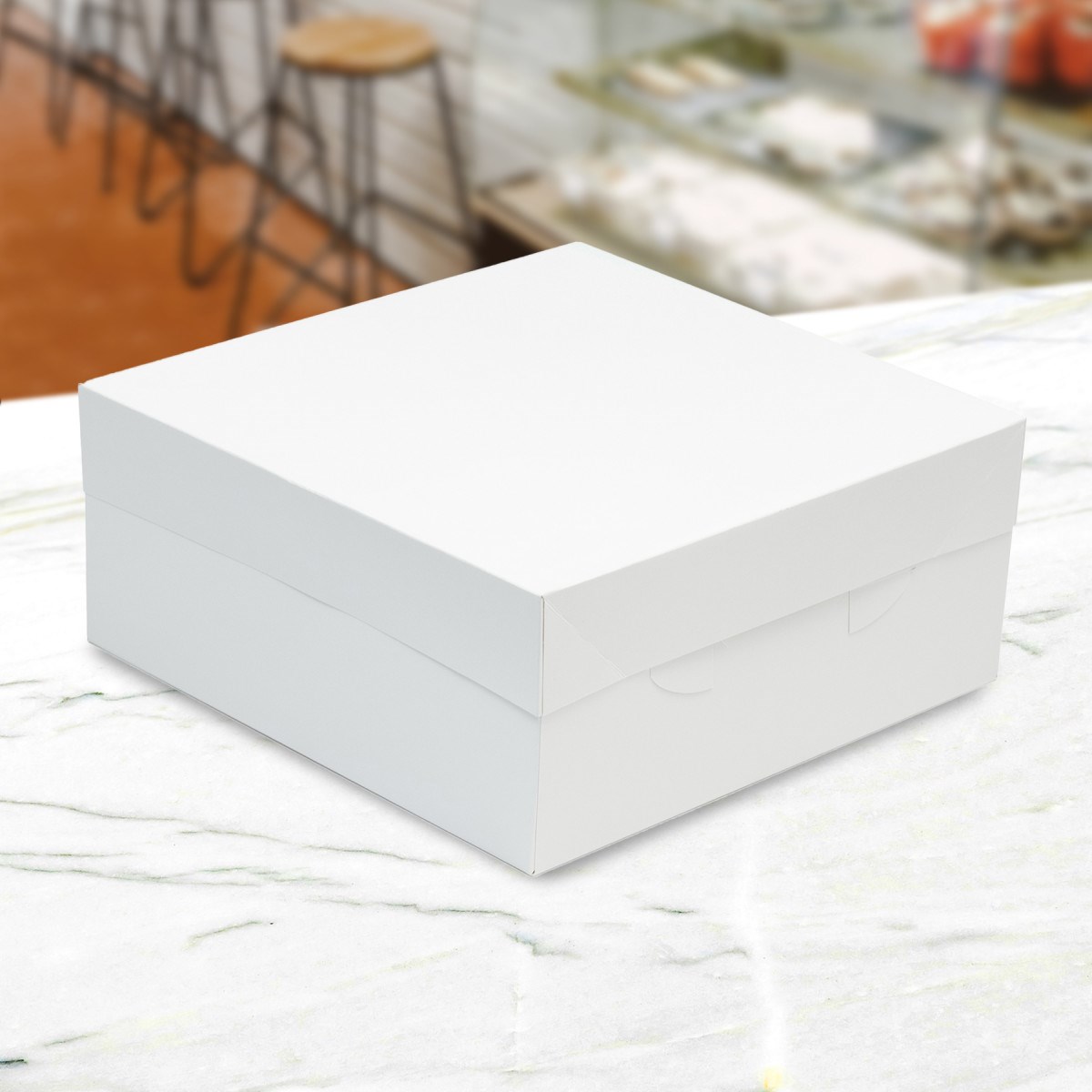 This single white cake box with lid comes folded and flat packed for convenient storage. The box base is quick and easy to assemble. The pre-glued lid fit perfectly on top.