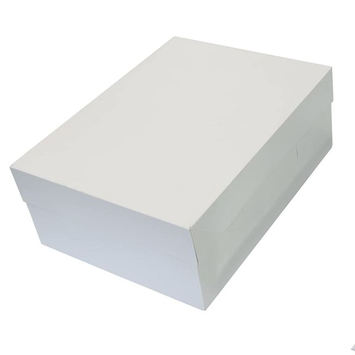 This standard height stapleless 12" x 9" rectangular cake box with lid is made in the UK. It is ideal for storing and transporting celebration cakes.