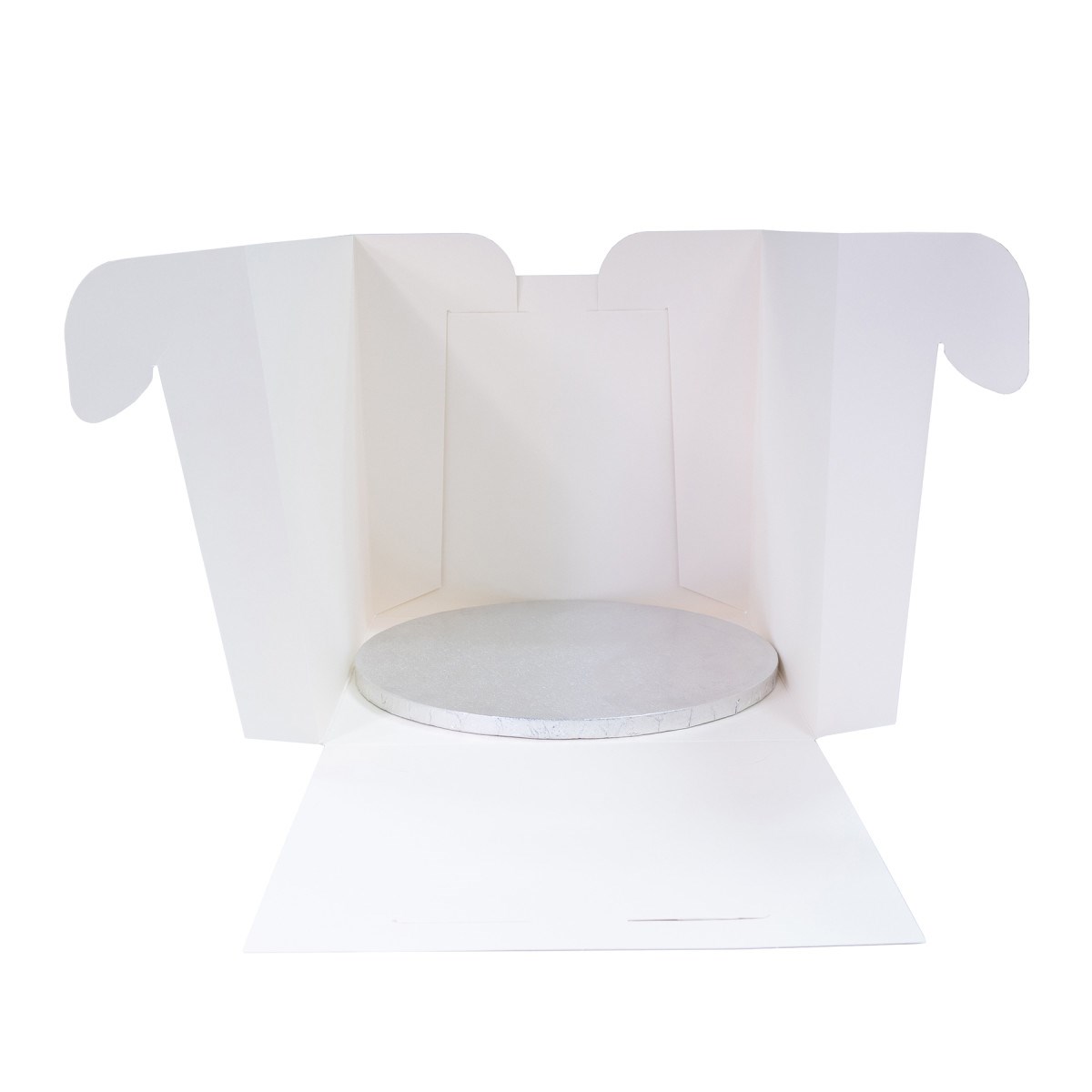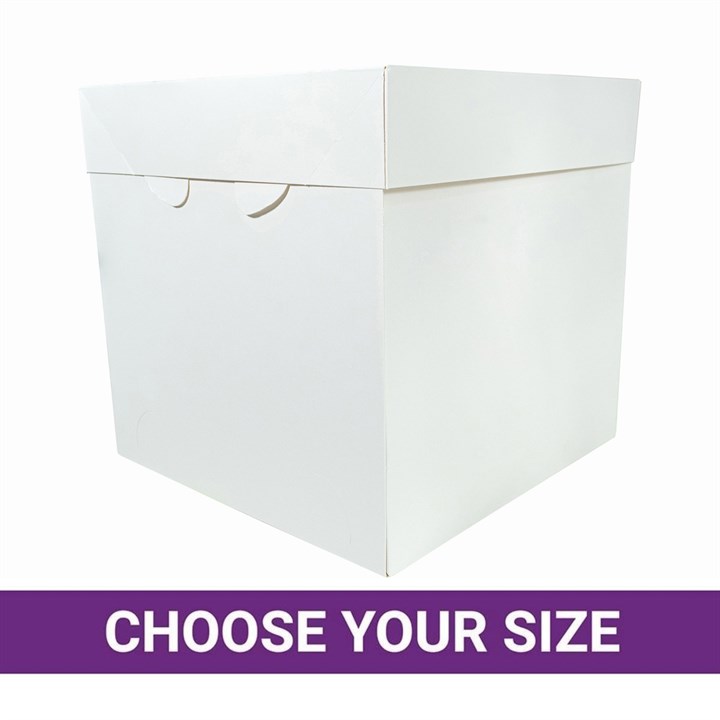 This top quality, sturdy cake box with lid comes flat packed for convenient storage. The box base is very quick and easy to assemble using interlocking die cut tabs. The lid is pre-glued and simply folds out.