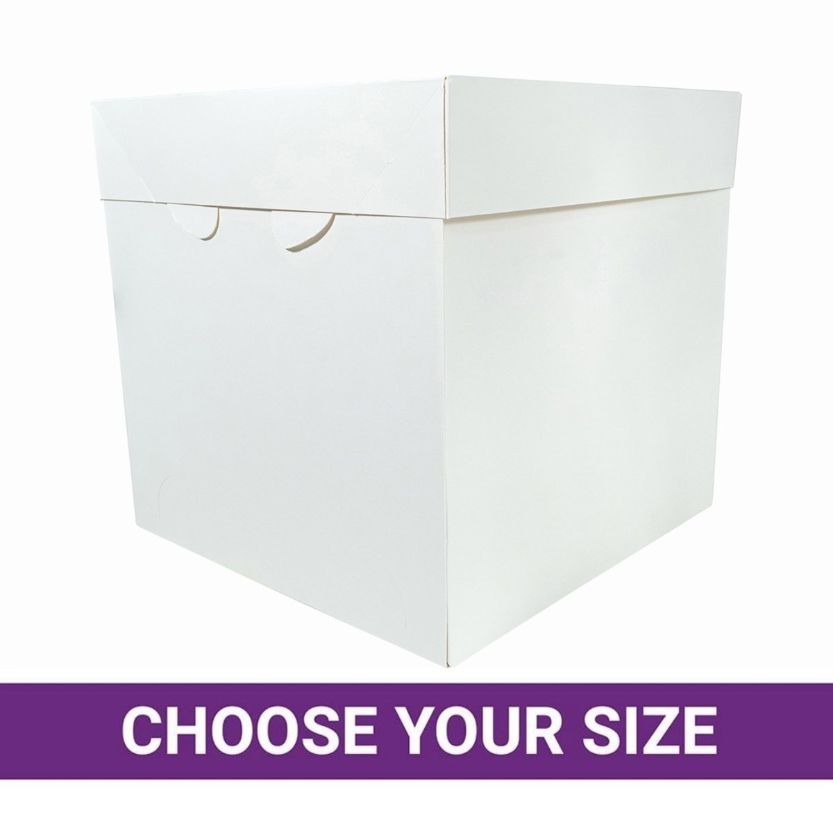 Each box base and comes with a separate lid. The cake box lid fits flush on top of the box making them particularly suitable for taller celebration cakes, multiple tiers and cakes with tall decorations.