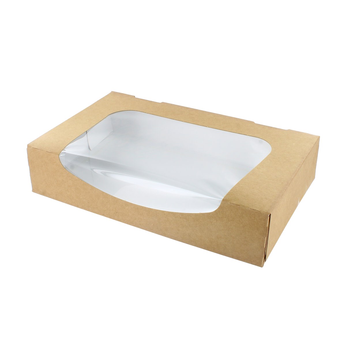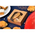 Rectangluar Pop-Up Window Boxes by Culpitt are perfect for transporting and displaying cookies, cake slices, and tarts. Rustic unbleached Kraft brown outer with a grease resistant white inner and large clear see-through window on the top and front.