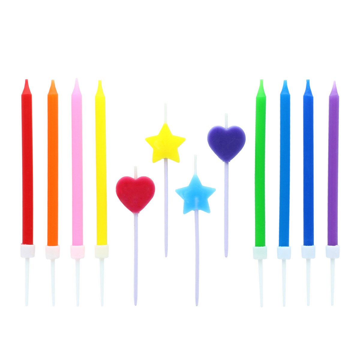 12 candles per pack:8 x tall candles in red, orange, pink, yellow, purple, blues and green, 2 x hearts in purple and red, 2 x stars in blue and yellow.