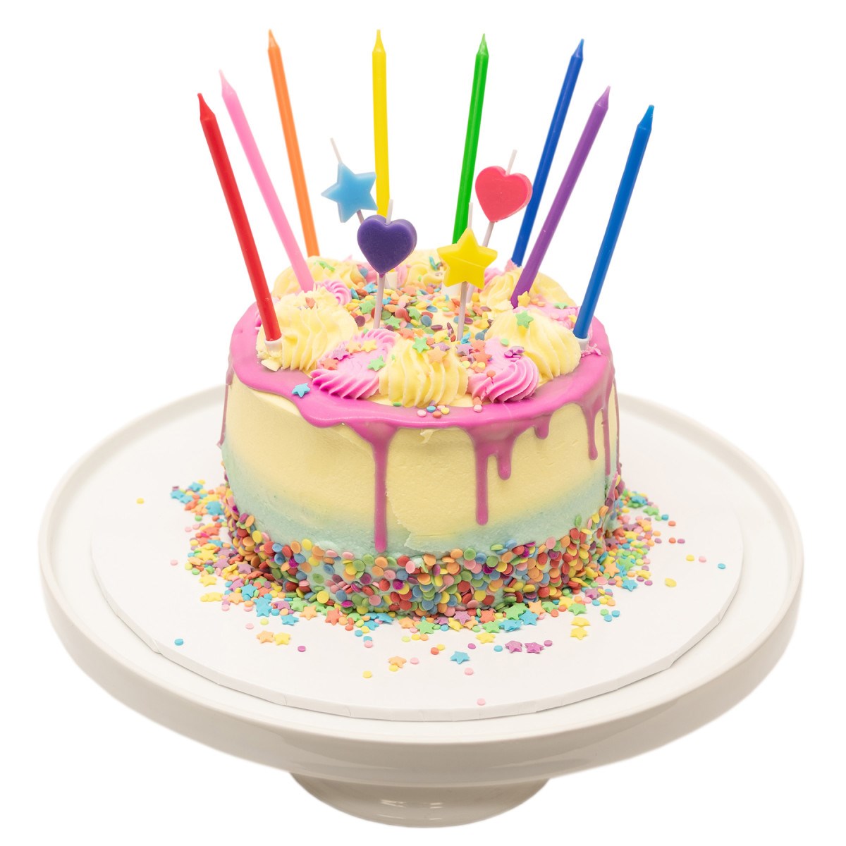 These colourful candles will make special occasion cakes shine brighter! The pack features a selection of tall, heart and star shaped candles, each with food-safe pics for placing directly on top of a cake. They can be used to enhance a simple cake or compliment a more elaborate design. The different shapes and sizes of candles in the set are a quick and easy way to add interest and fun to the top of cakes.