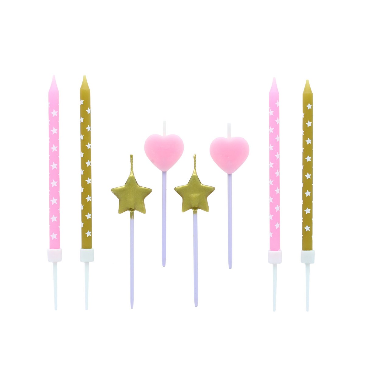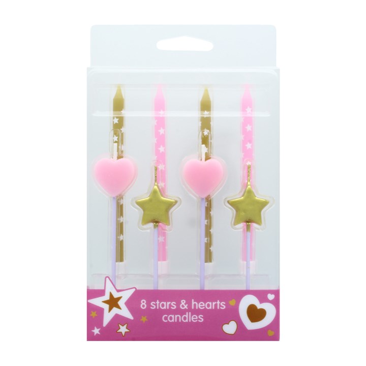 8 candles per pack: 2 x tall gold with white star print, 2 x tall pink with white star print, 2 x gold star candles, 2 x pink heart candles.