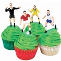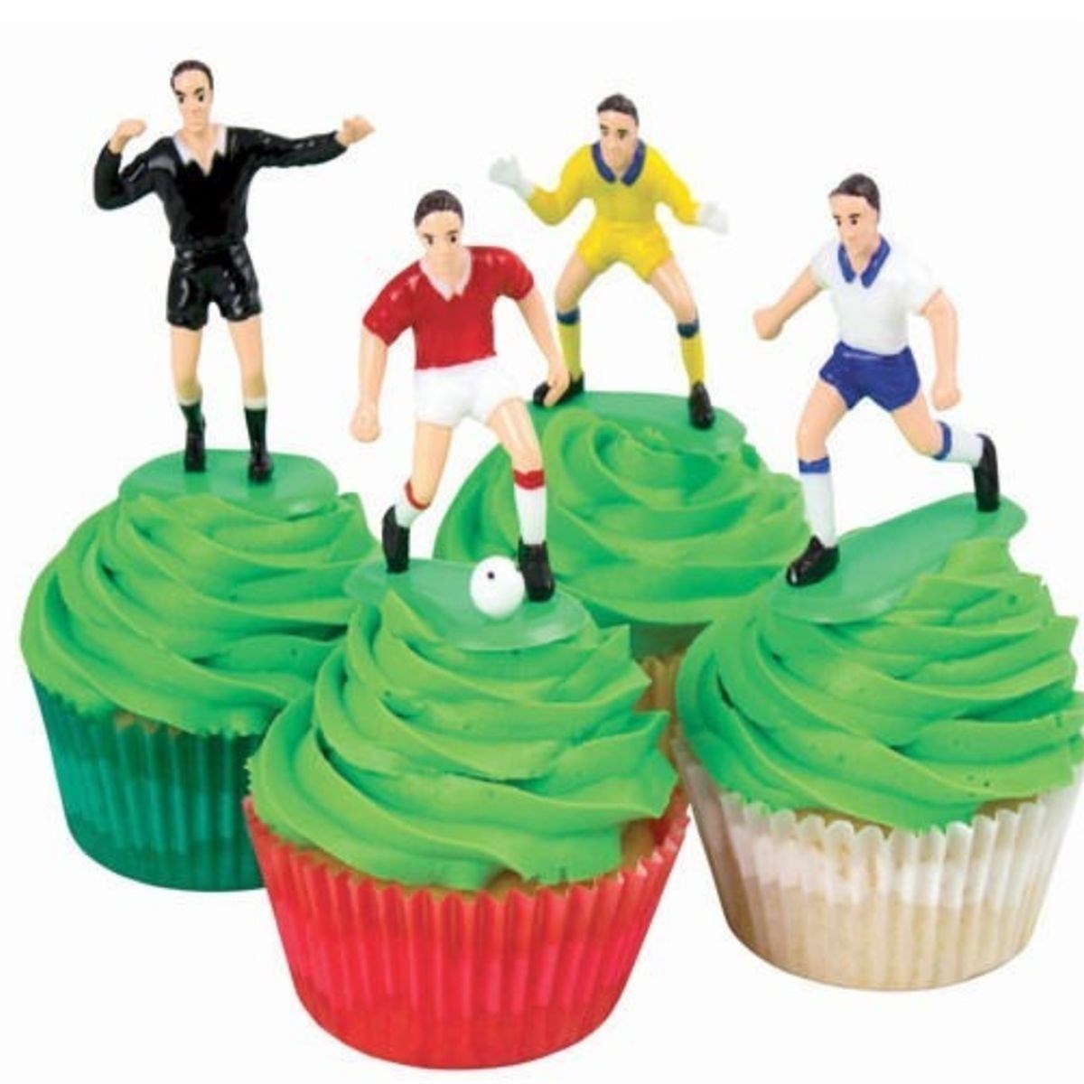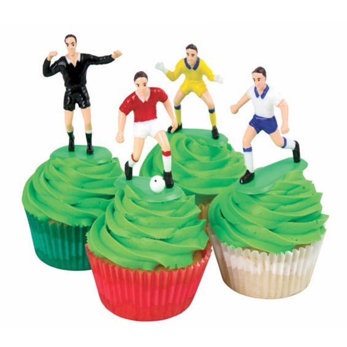 2 Goal keepers, one in Green with his arms up (65mm tall) and one in Yellow slightly crouching (55mm tall)
