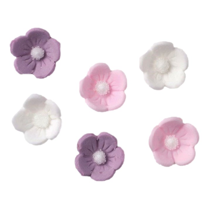 These lovely Sugar flower cake decorations are individually hand made using a hardened sugar paste which is cut, textured and formed to the finished shape, the edges of the petals are then dusted with food colour and finished with a coloured royal icing centre. They make great cupcake decorations, or they can be combined in a pattern to decorate a full sized cake.