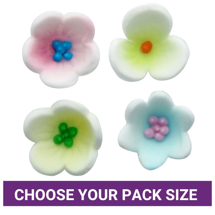 These delightful mini flowers are are individually hand made using a hardened sugar paste which is cut, textured and formed to the finished shape, the edges of the petals are then dusted with food colour and finished with a coloured royal icing centre.